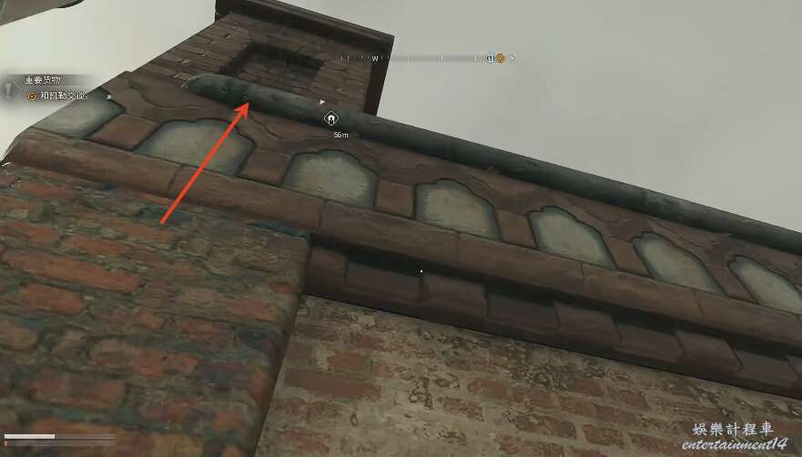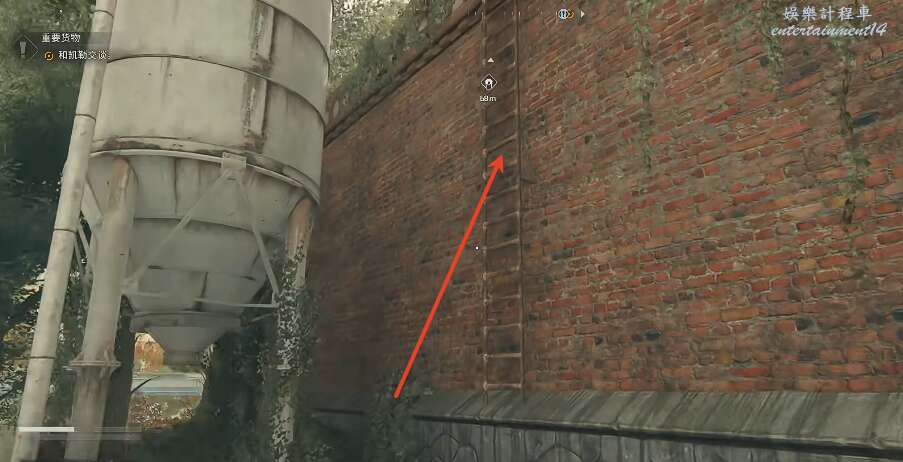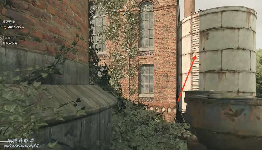 進入之後面朝煙囪的位置,從牆上的梯子往上爬。