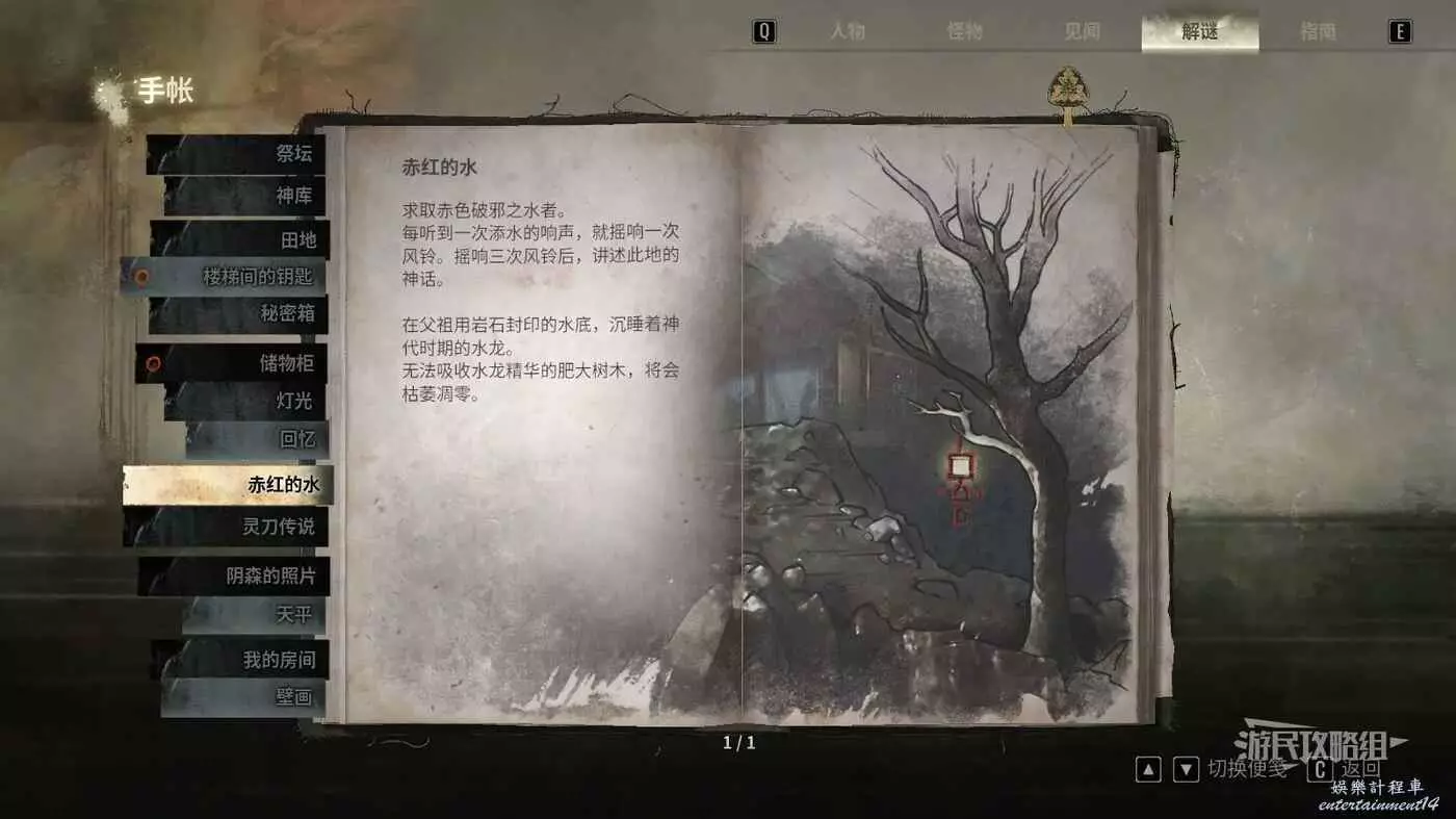 沉默之丘 f (Silent Hill f) 赤紅的水謎題解法 29 9 月 2025-09-29 廣告 作者:瑞破受氣包 來源:遊民星空 二周目正殿-赤紅的水 位於帶有狐仙紋章的門後方,水邊有一塊刻有此謎題的石碑。需要按照特定順序敲響區域內5個風鈴中的3個,每次只能敲1個,每次敲擊都需要在水池裡的竹簡注滿水傾斜發出響聲時進行。每個風鈴上掛著的燈籠標有符號,是敲鐘順序的指引。 【風鈴1】火山符號,位於靠近寺廟入口的高處 【風鈴2】水符號,位於謎題石碑旁邊的小島上 【風鈴3】樹符號,位於右側路上的石橋上