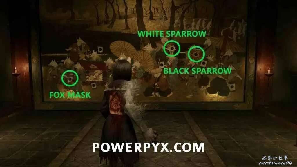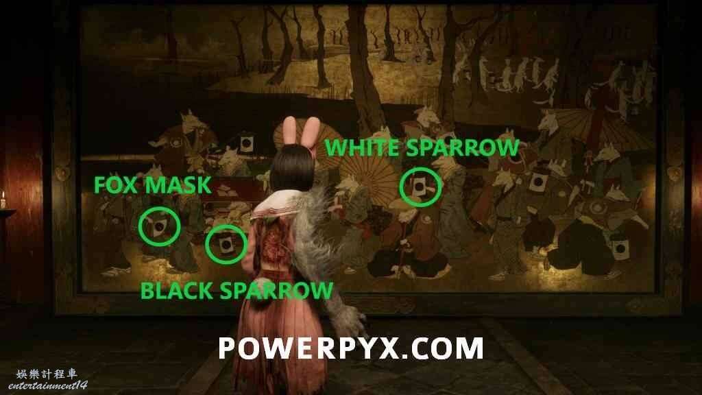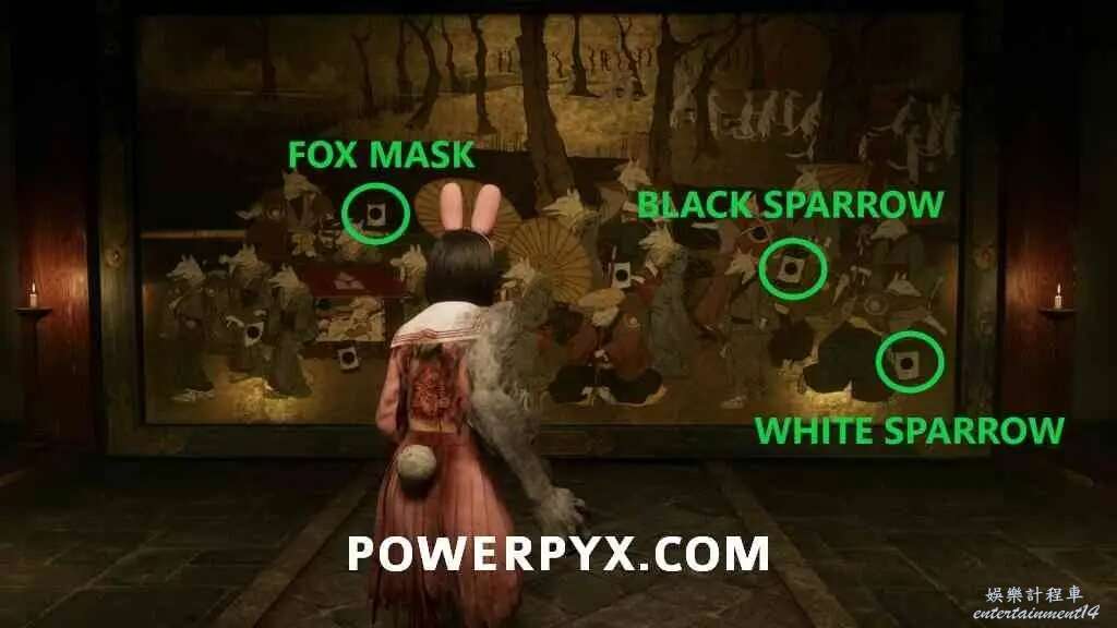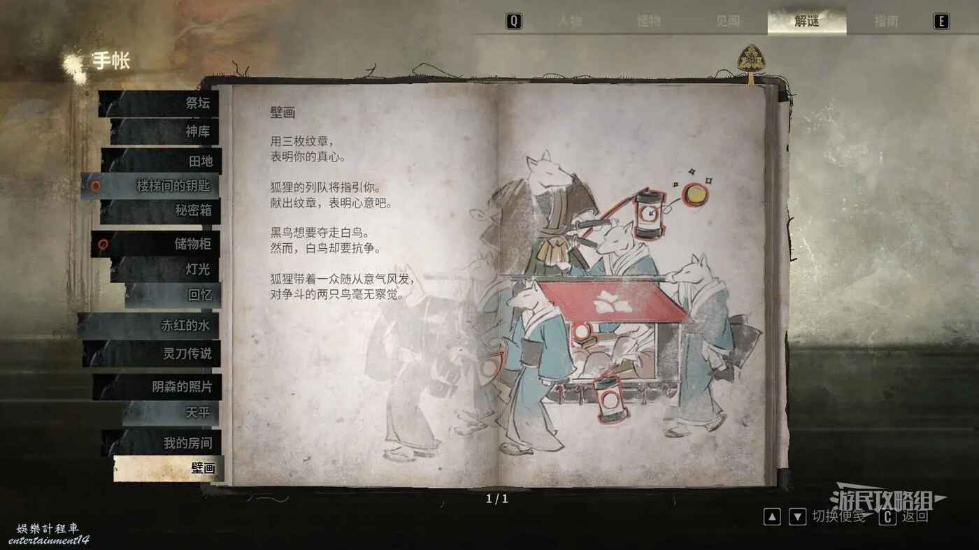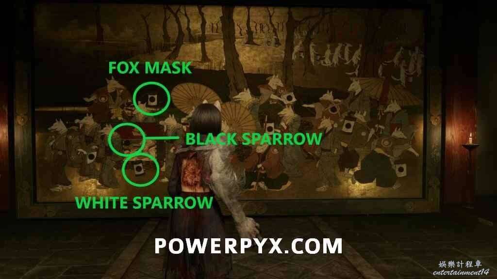 黑雀紋章放入狐面紋章右側的空位,圖案是紅箱子下方的燈籠。