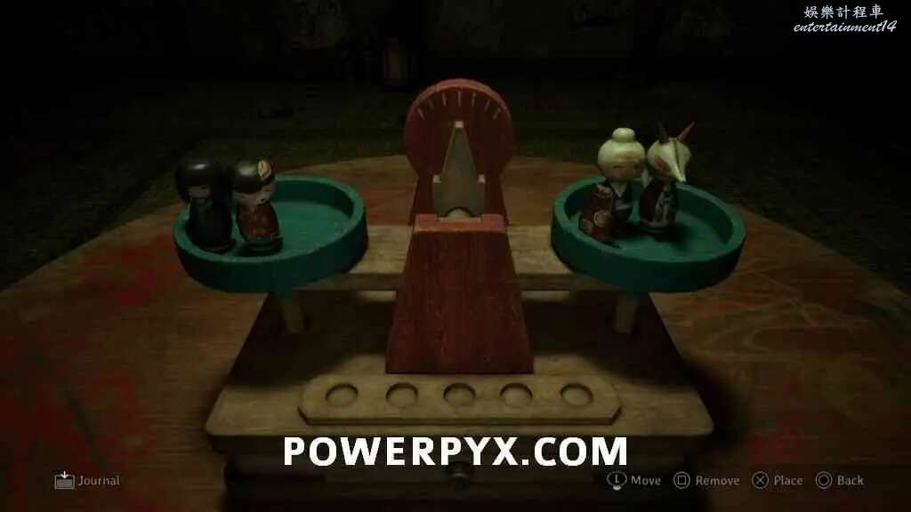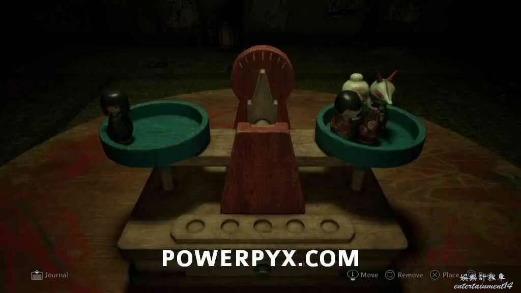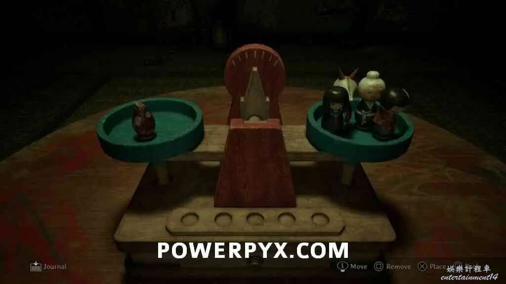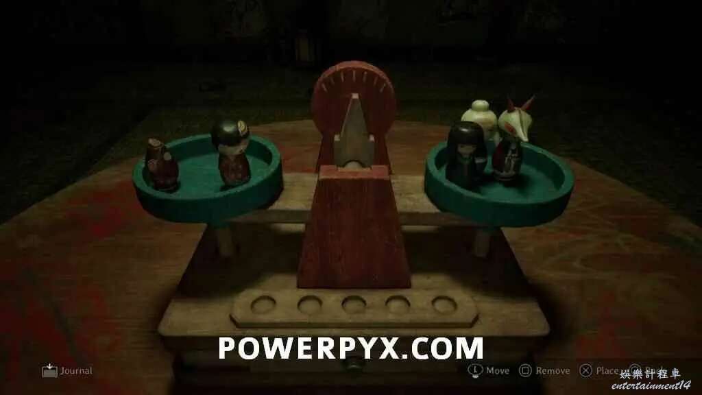 【結局1-詛咒如雛鳥般歸來】需要將5個玩偶放在天平上保持平衡。