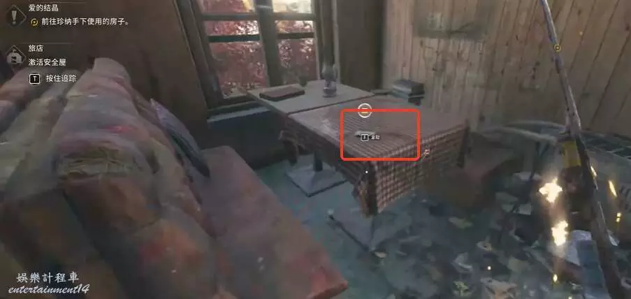 在最裡邊屋子的桌子上拾取。(這裡有個藍色的床)