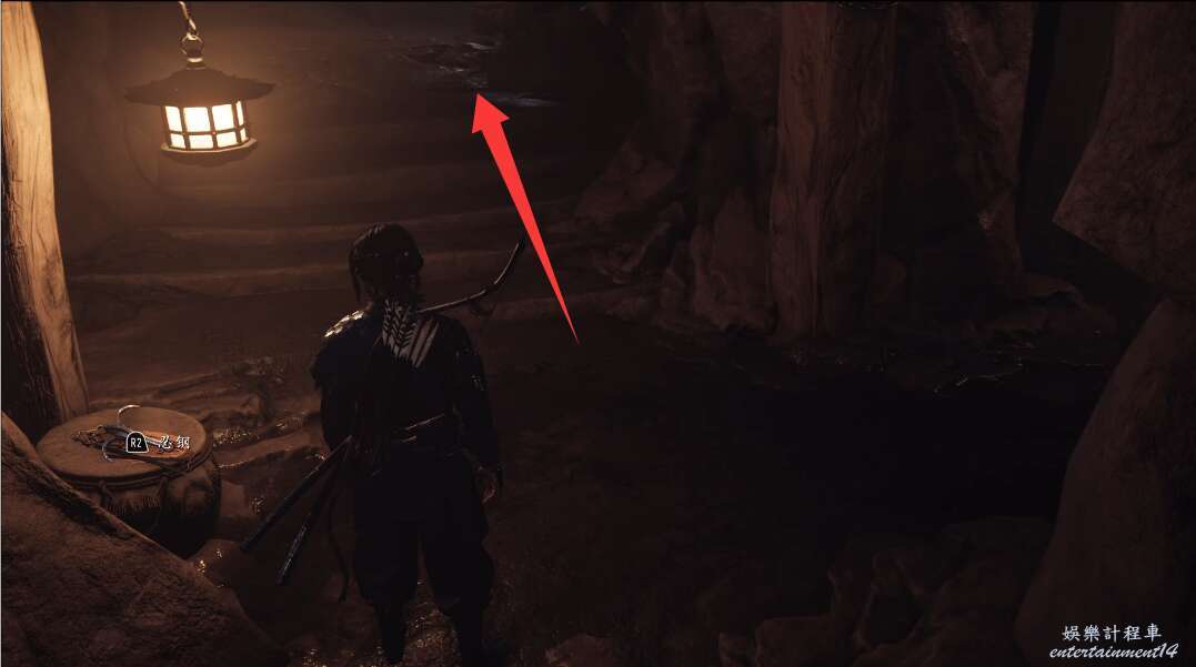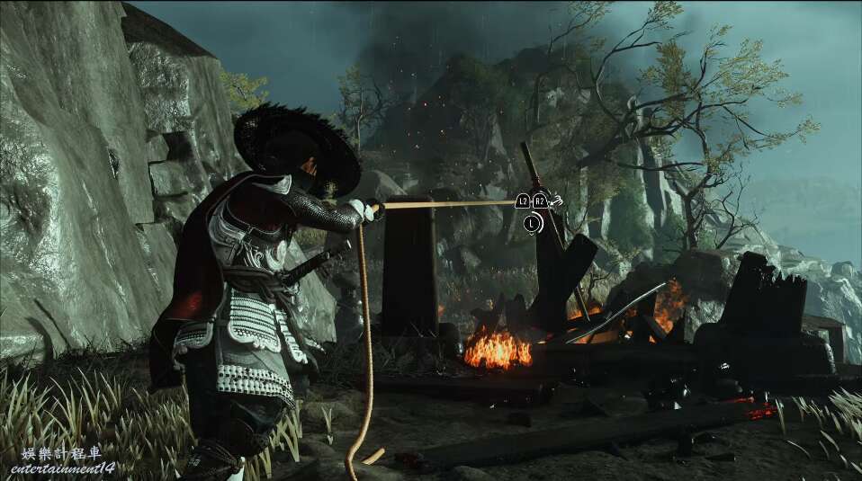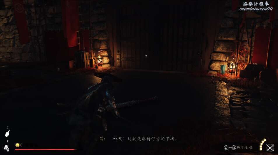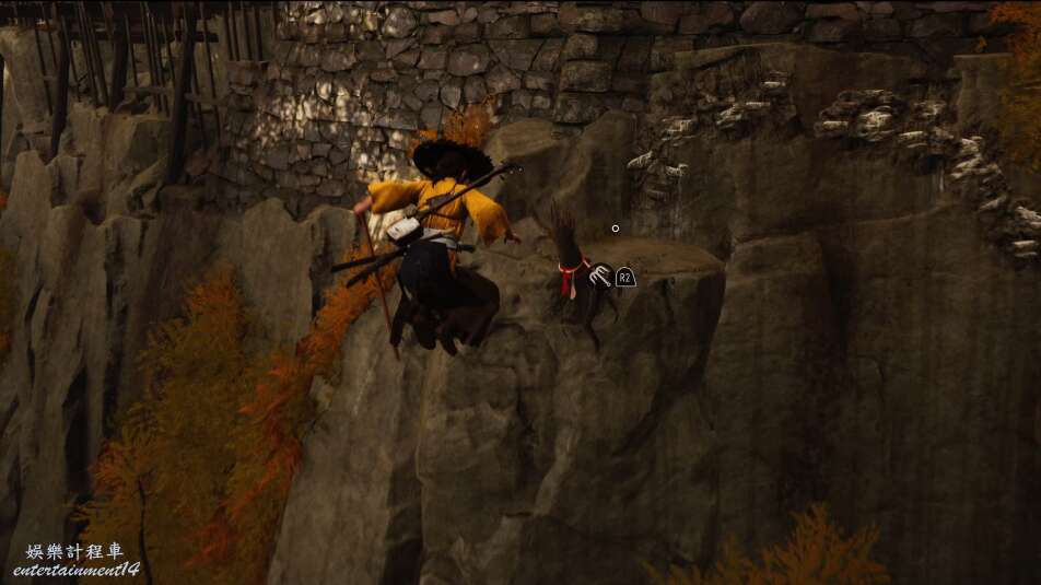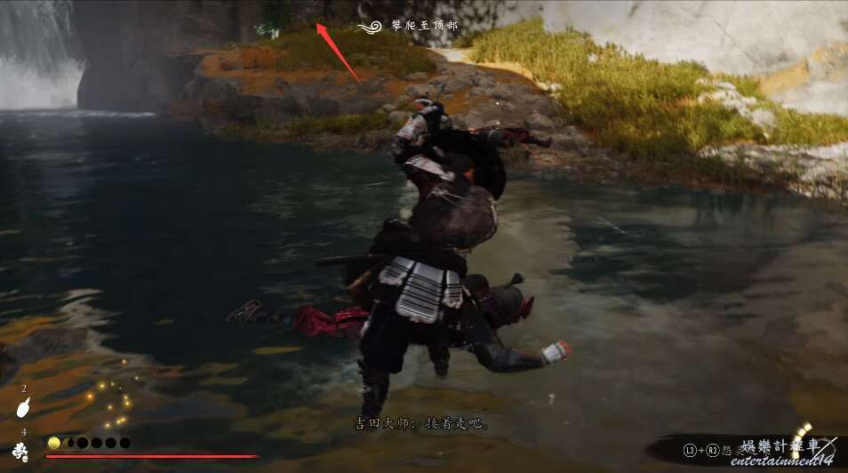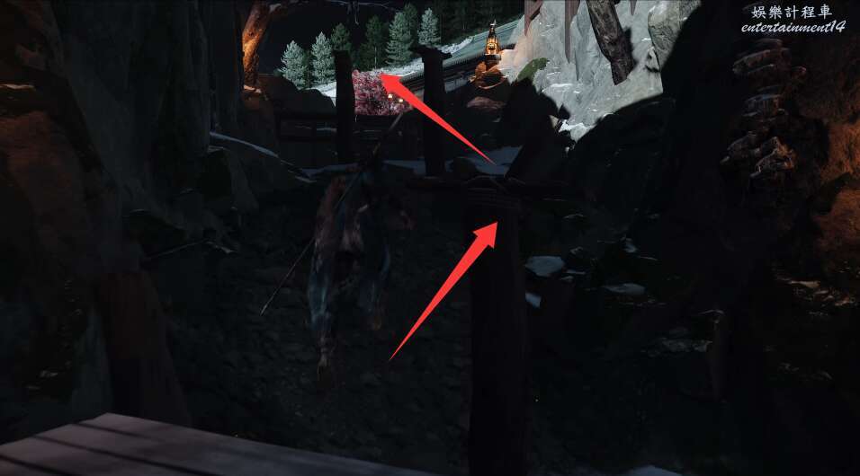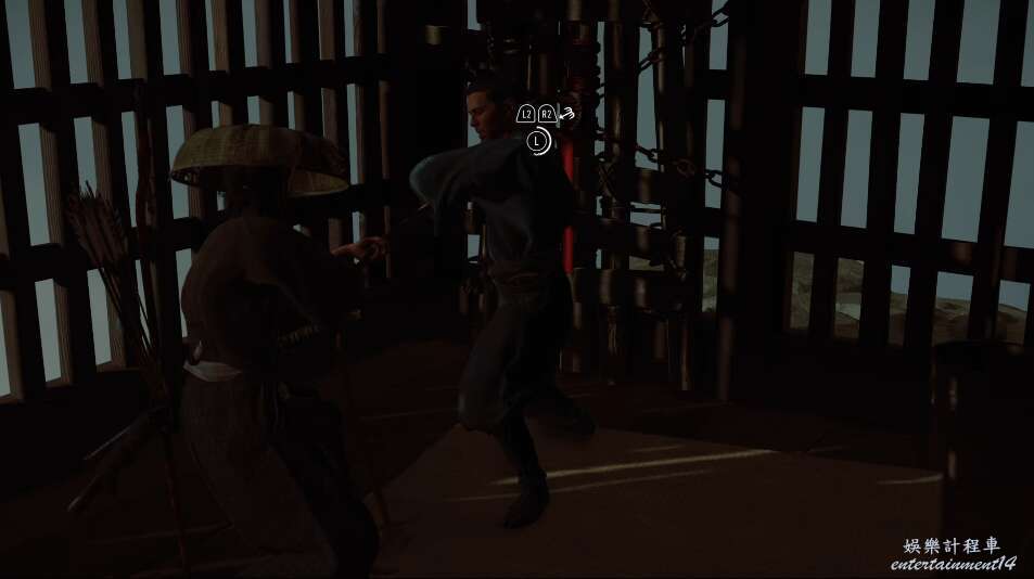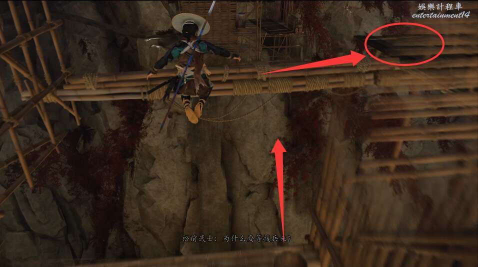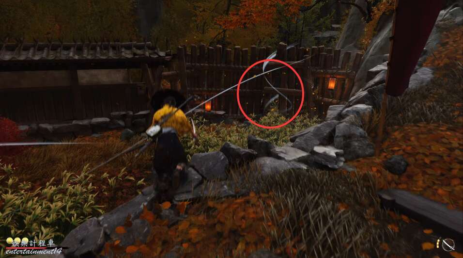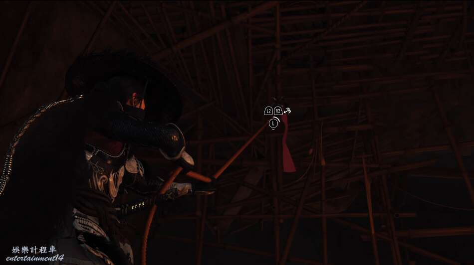 前方有雙刀大師半兵衛為了阻止有人來犯設計的陷阱,我們可以利用R2使用鉤鎖爬上去。