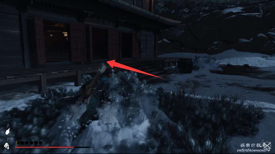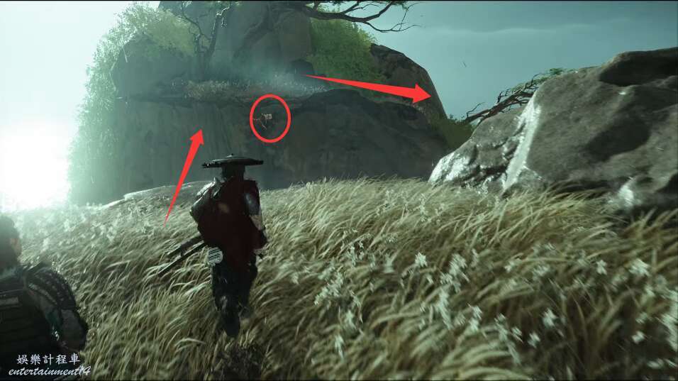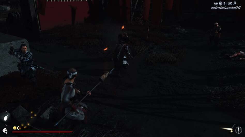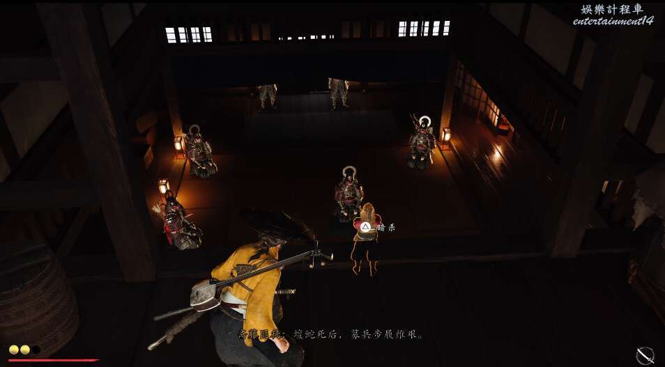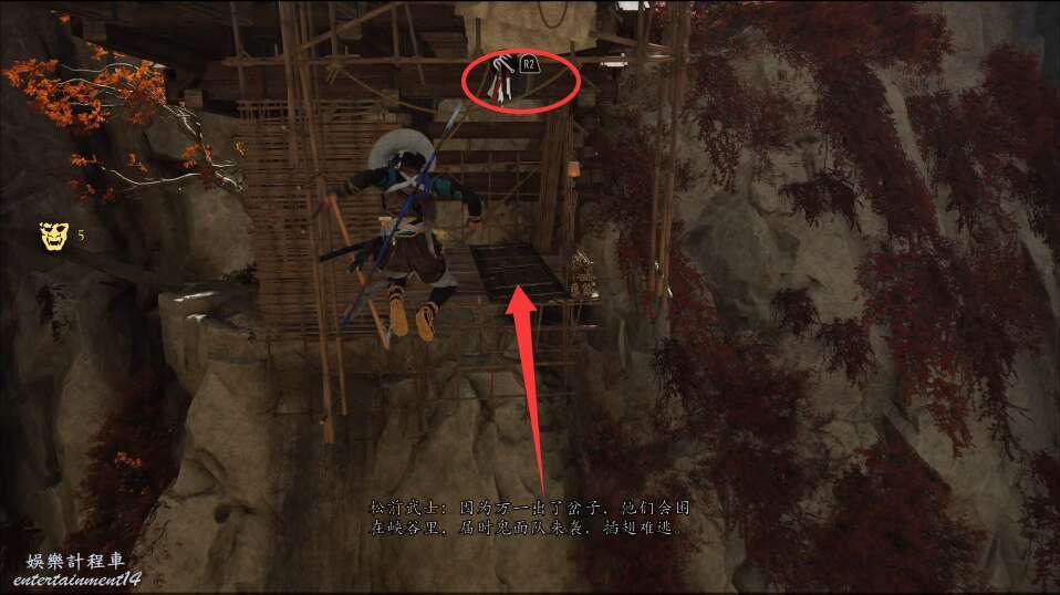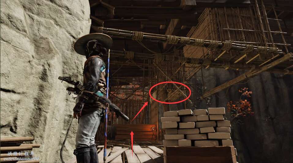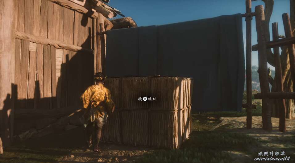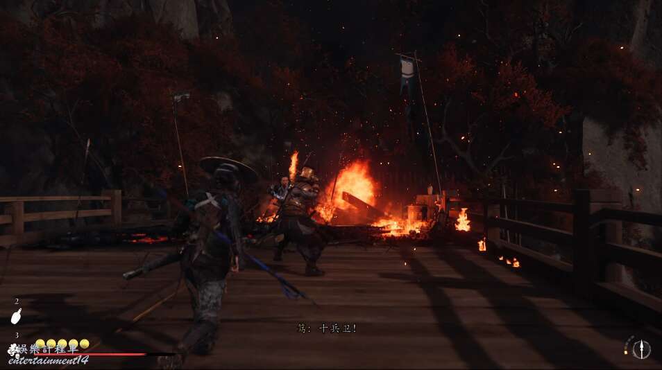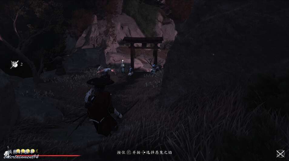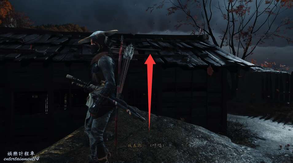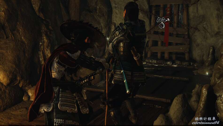 前方有雙刀大師半兵衛為了阻止有人來犯設計的陷阱,我們可以利用R2使用鉤鎖爬上去。