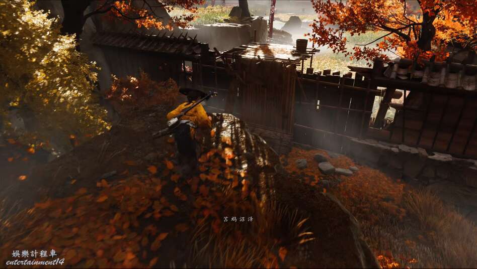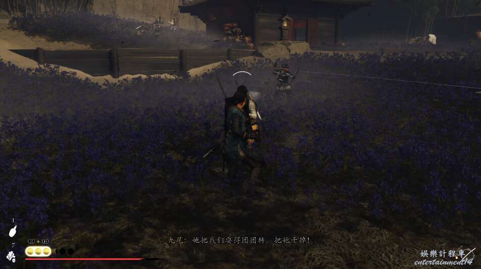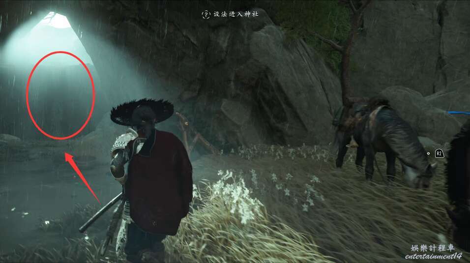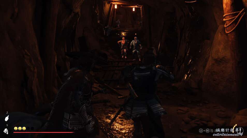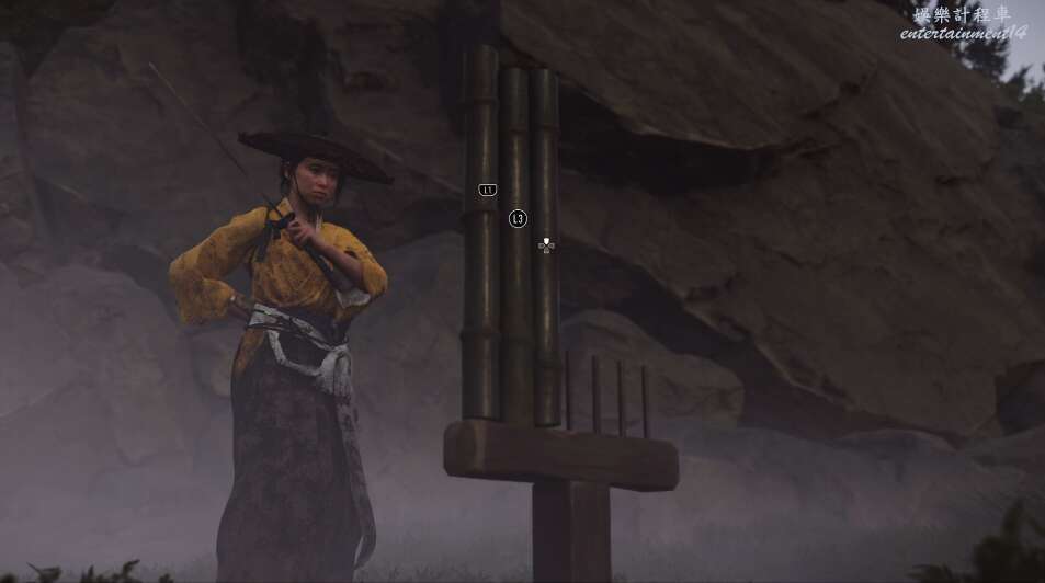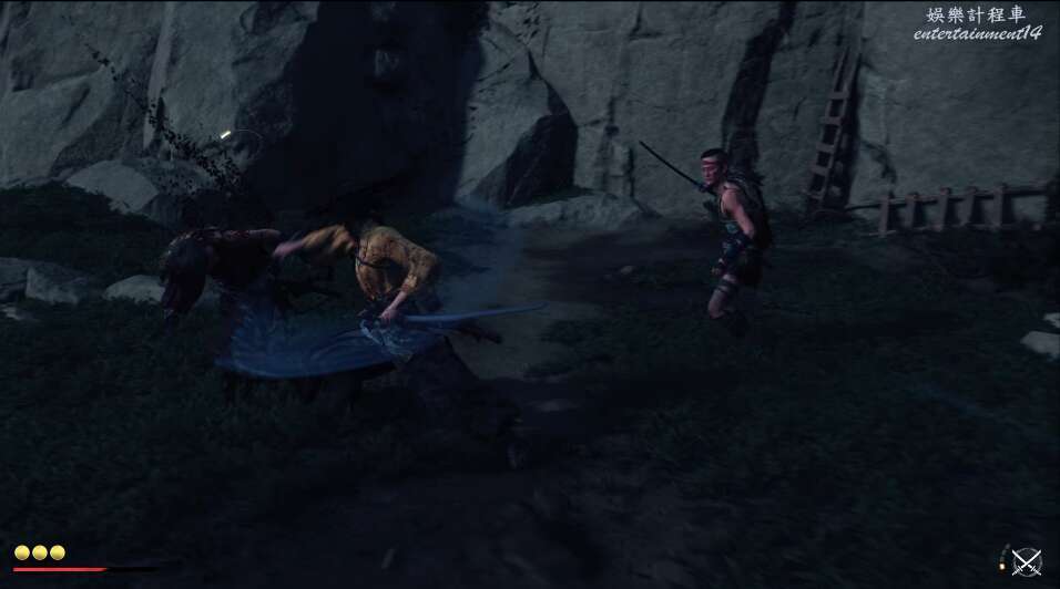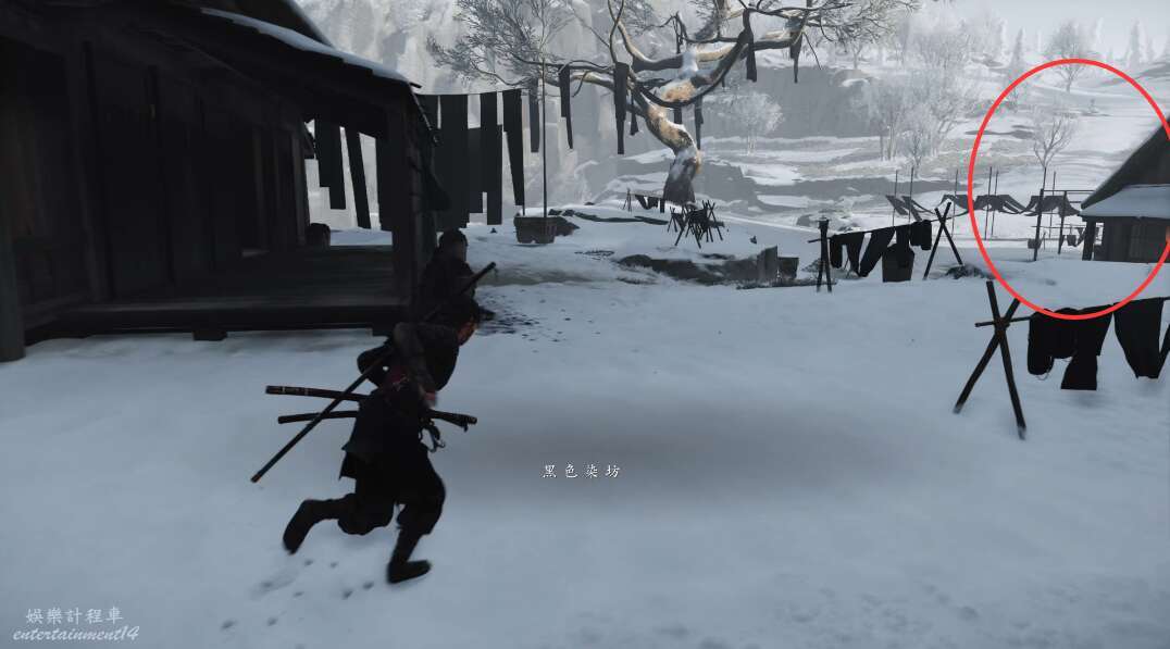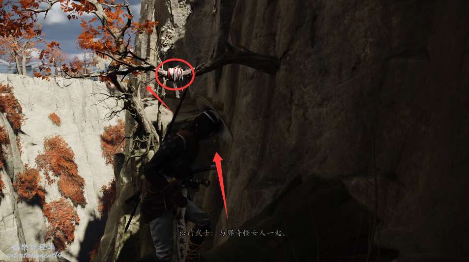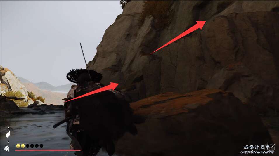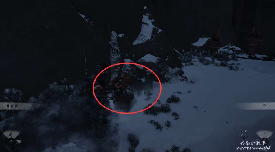 前方有雙刀大師半兵衛為了阻止有人來犯設計的陷阱,我們可以利用R2使用鉤鎖爬上去。