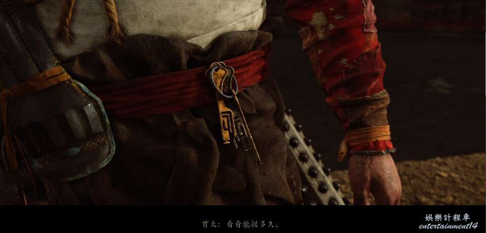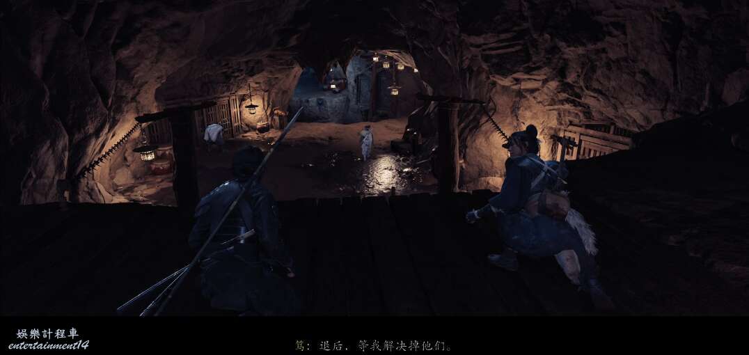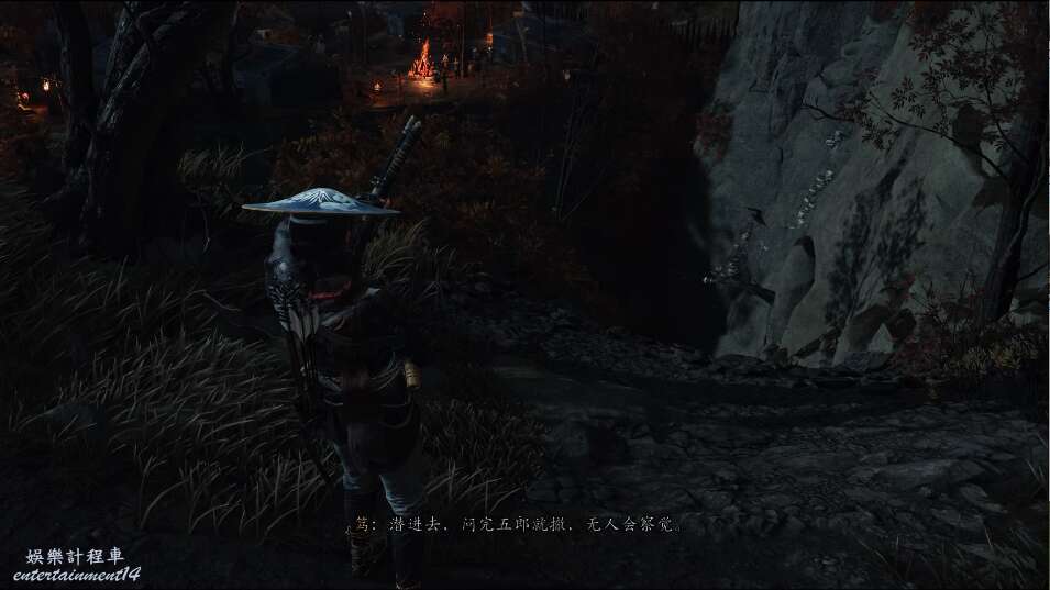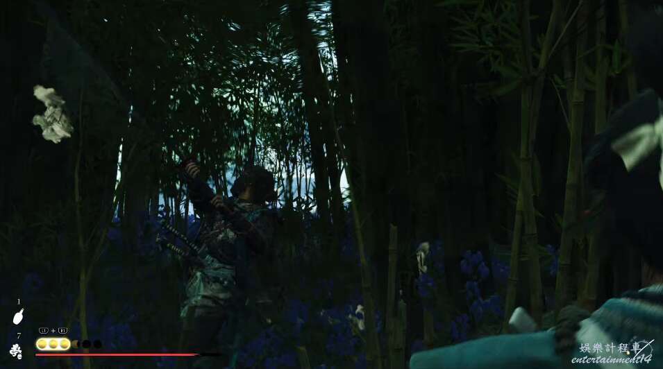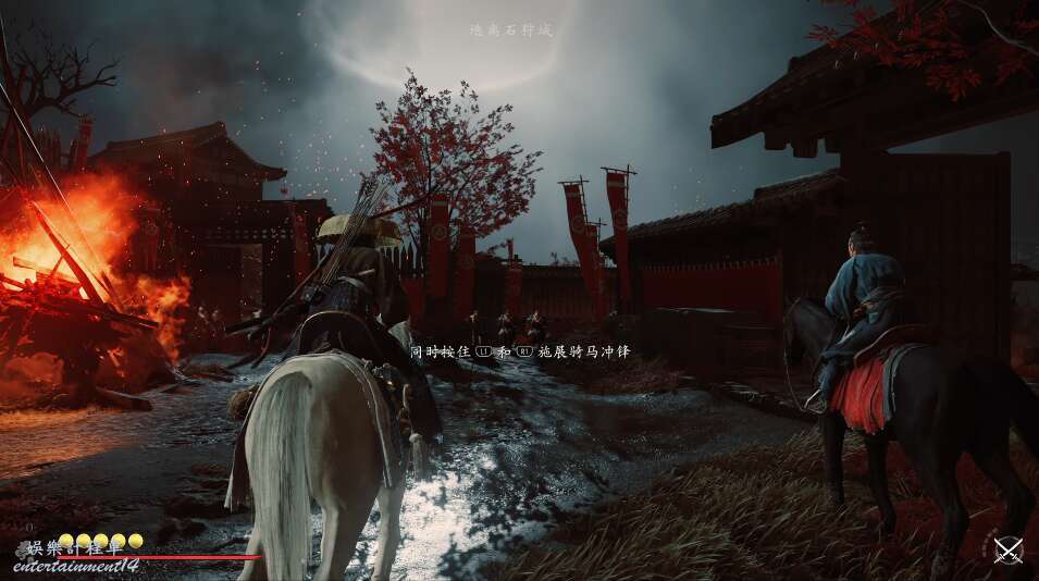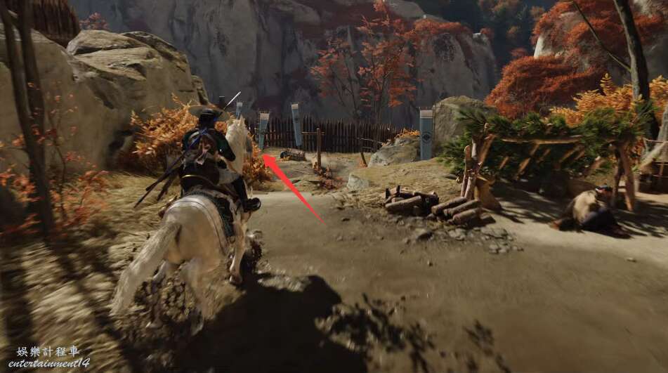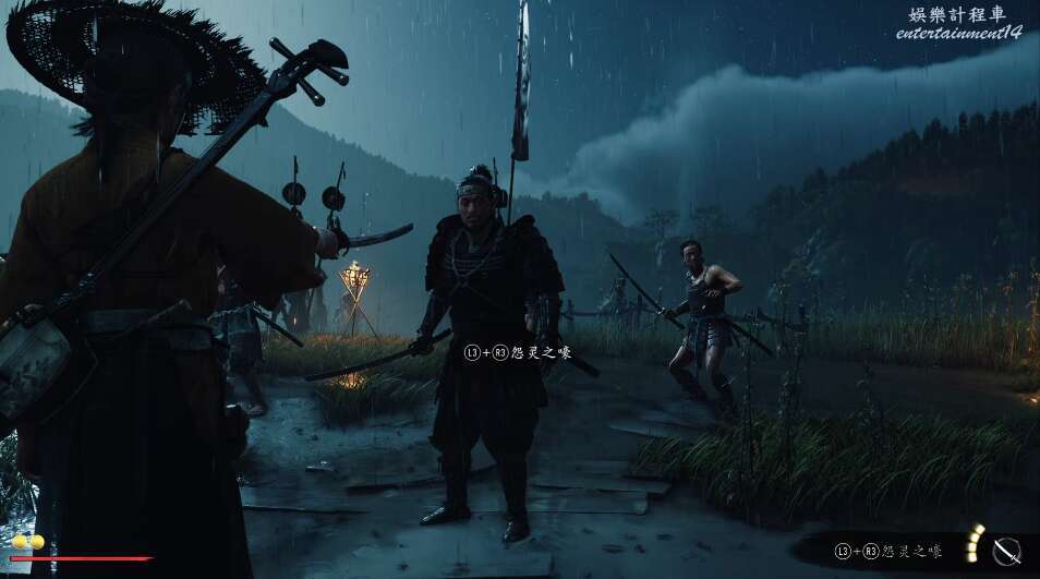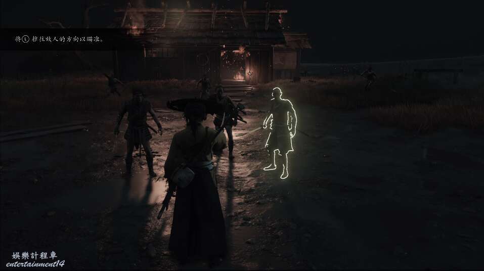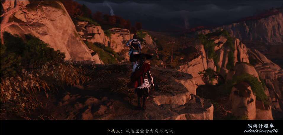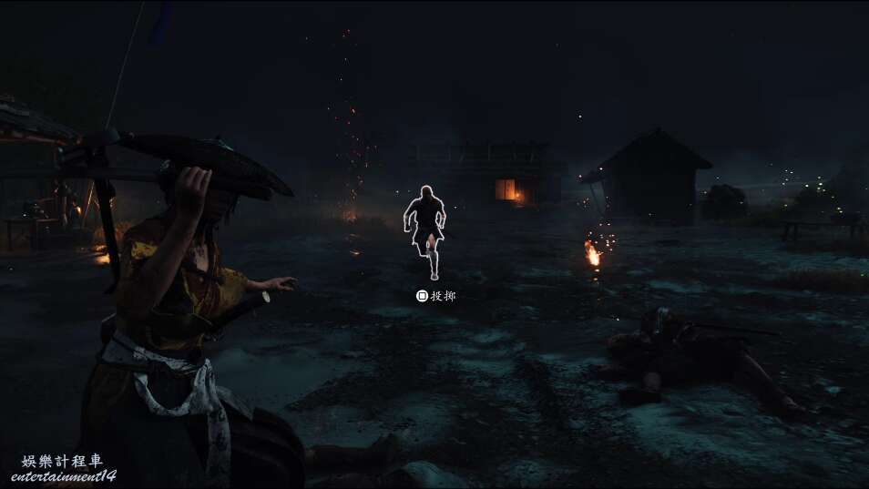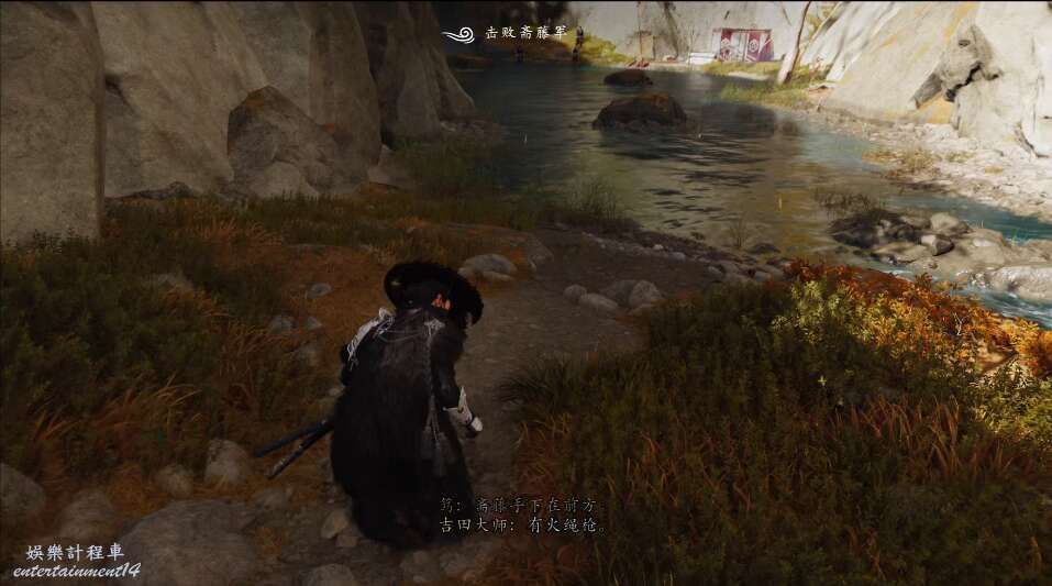前方有雙刀大師半兵衛為了阻止有人來犯設計的陷阱,我們可以利用R2使用鉤鎖爬上去。