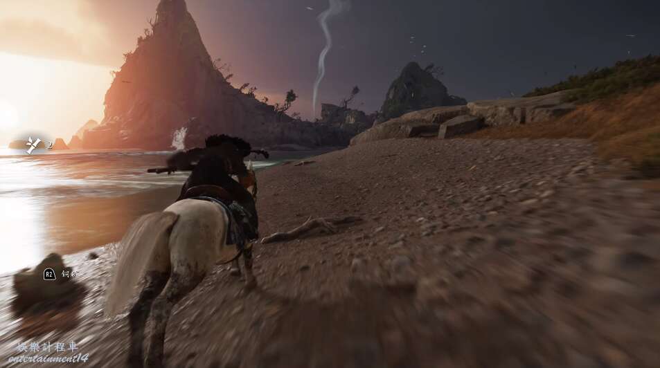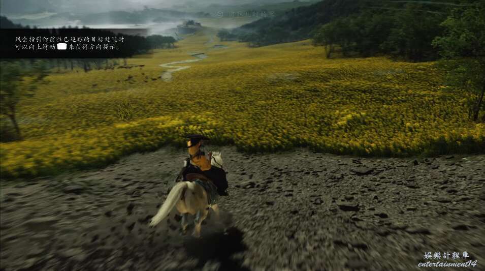 來到平原,騎馬前進,將觸控式螢幕上劃可以觸發任務跟隨,跟著風的指引前行。