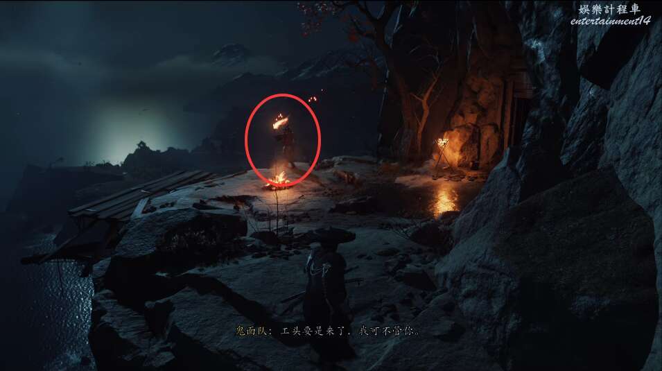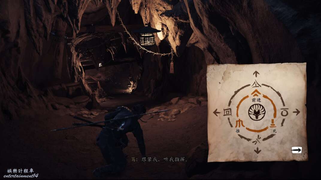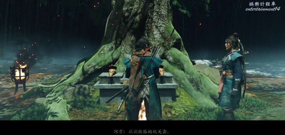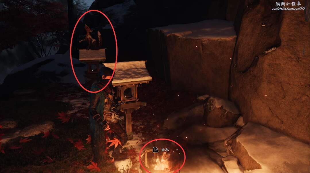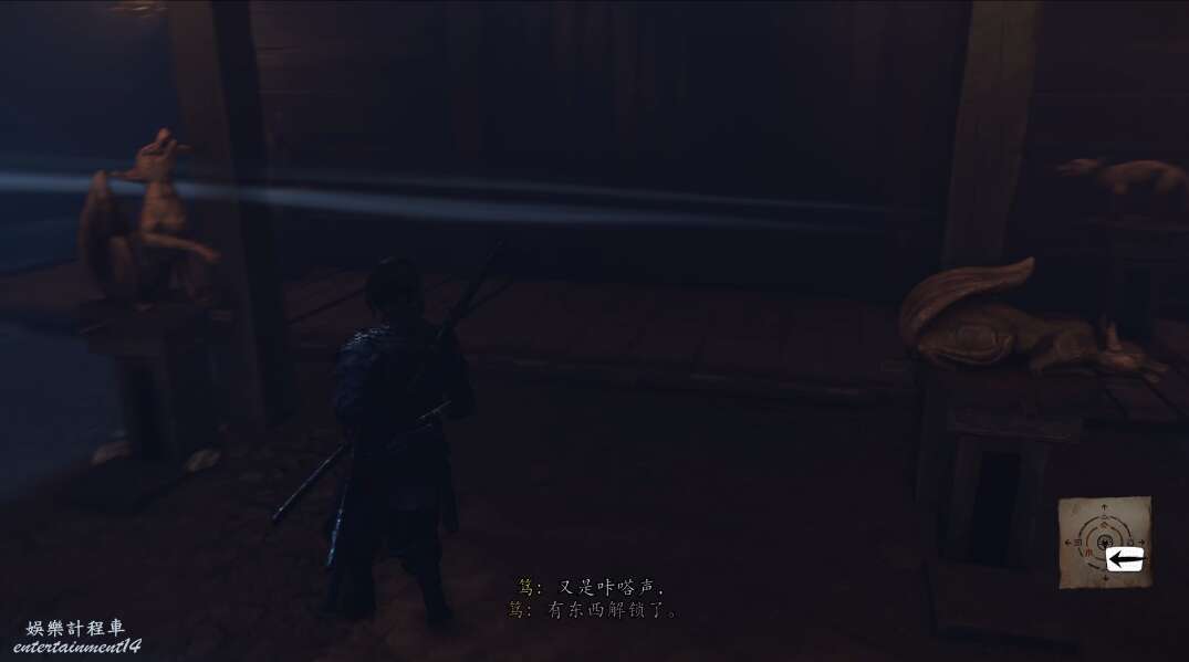來到道路盡頭。撿起火把,點亮旁邊有與中心三個狐狸相同的燈籠,即可打開開關,當我們上前把狡狐的機關盒放置上去,暗門便打開了。