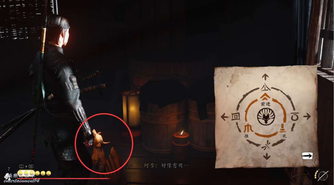 進入密室之後,我們會得到一個關於狐的機關盒,回去帶給阿雪,說不定她知道什麼。