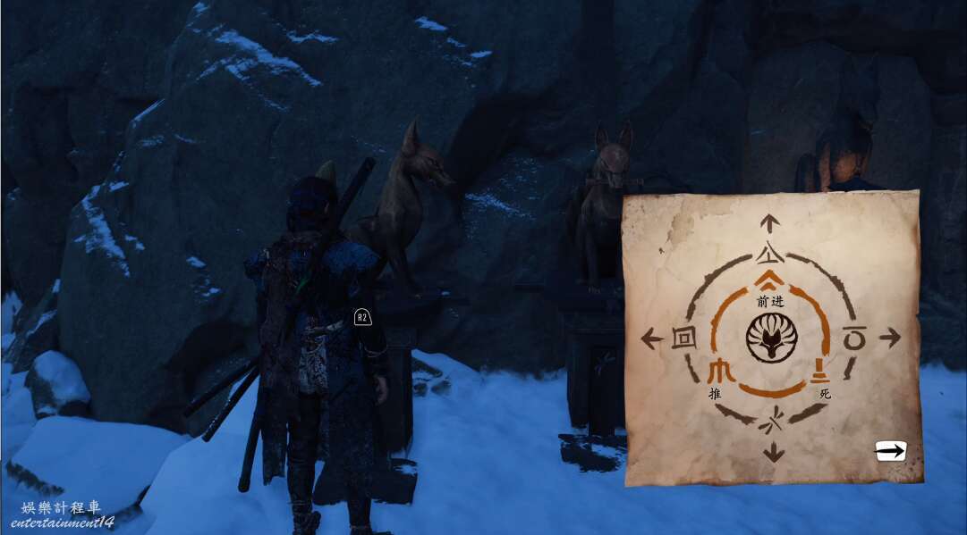 將此地中心的狐狸雕像機關從左往右轉動方向為右上左即可打開第二個暗門。