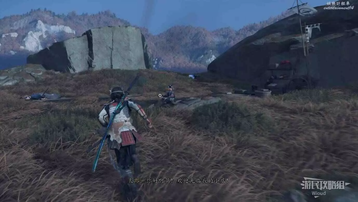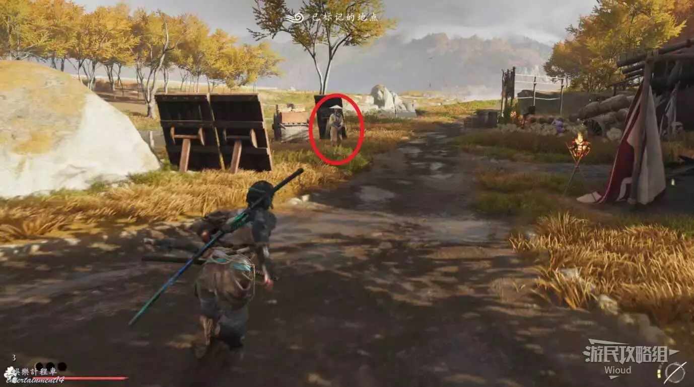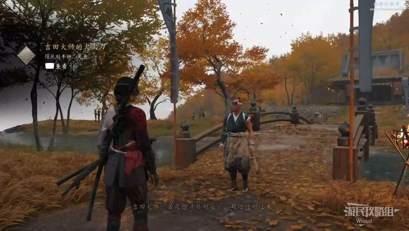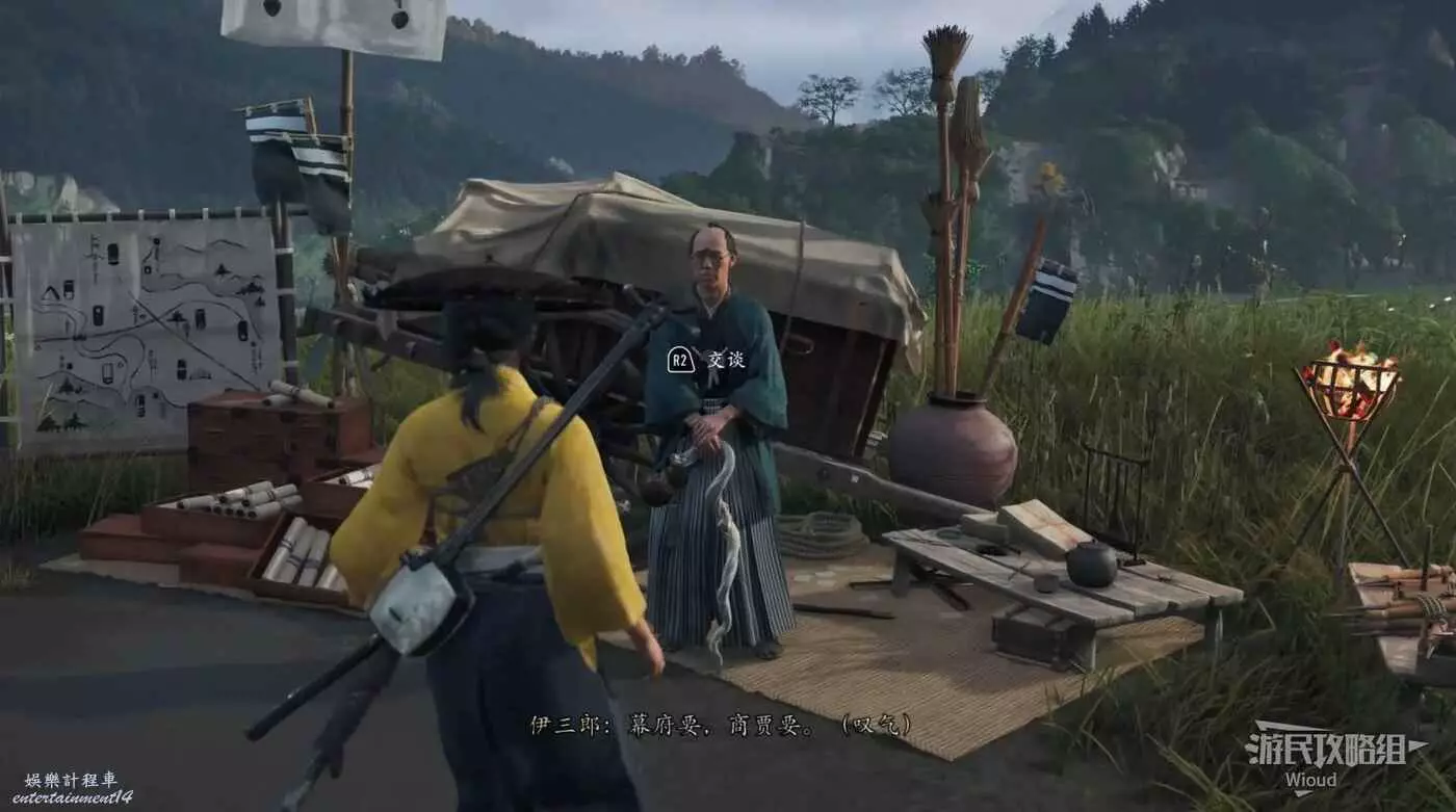 來到目的地和橋樑前的武士對話接取任務,然後跟著商人走到一個營地過劇情。