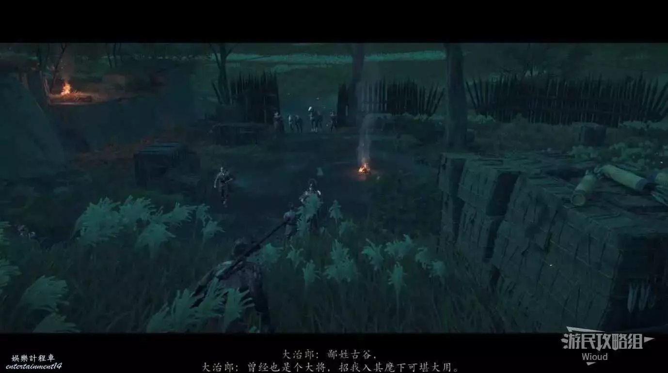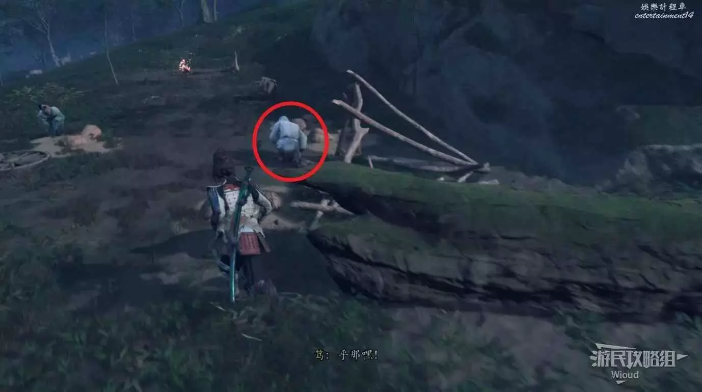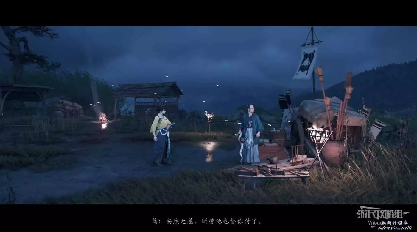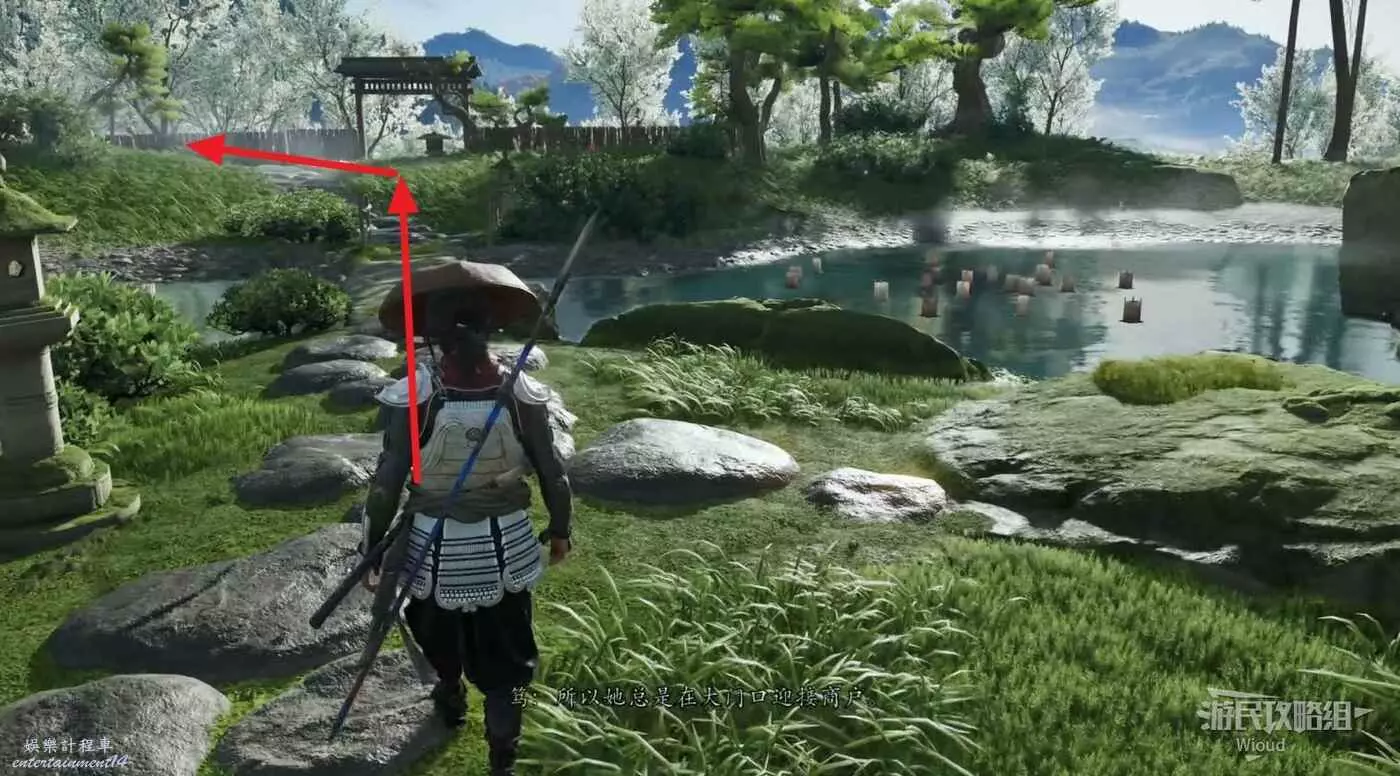 來到目的地和橋樑前的武士對話接取任務,然後跟著商人走到一個營地過劇情。