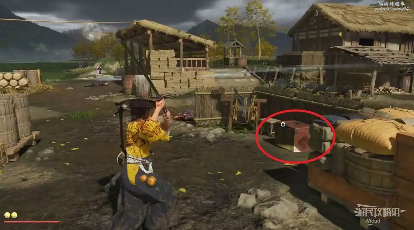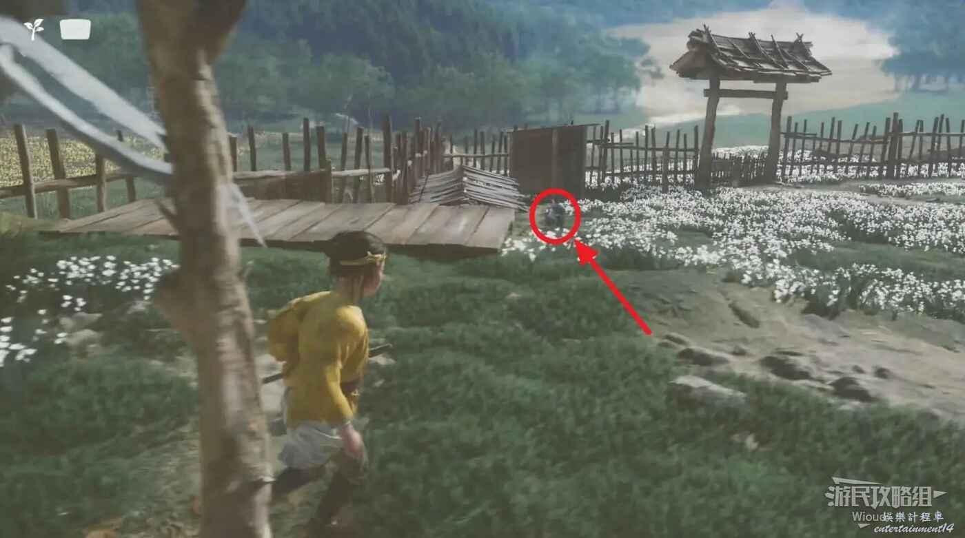 房子右側繼續往深處走,被圍起來的地方有個寶箱,具體位置如下圖所示。