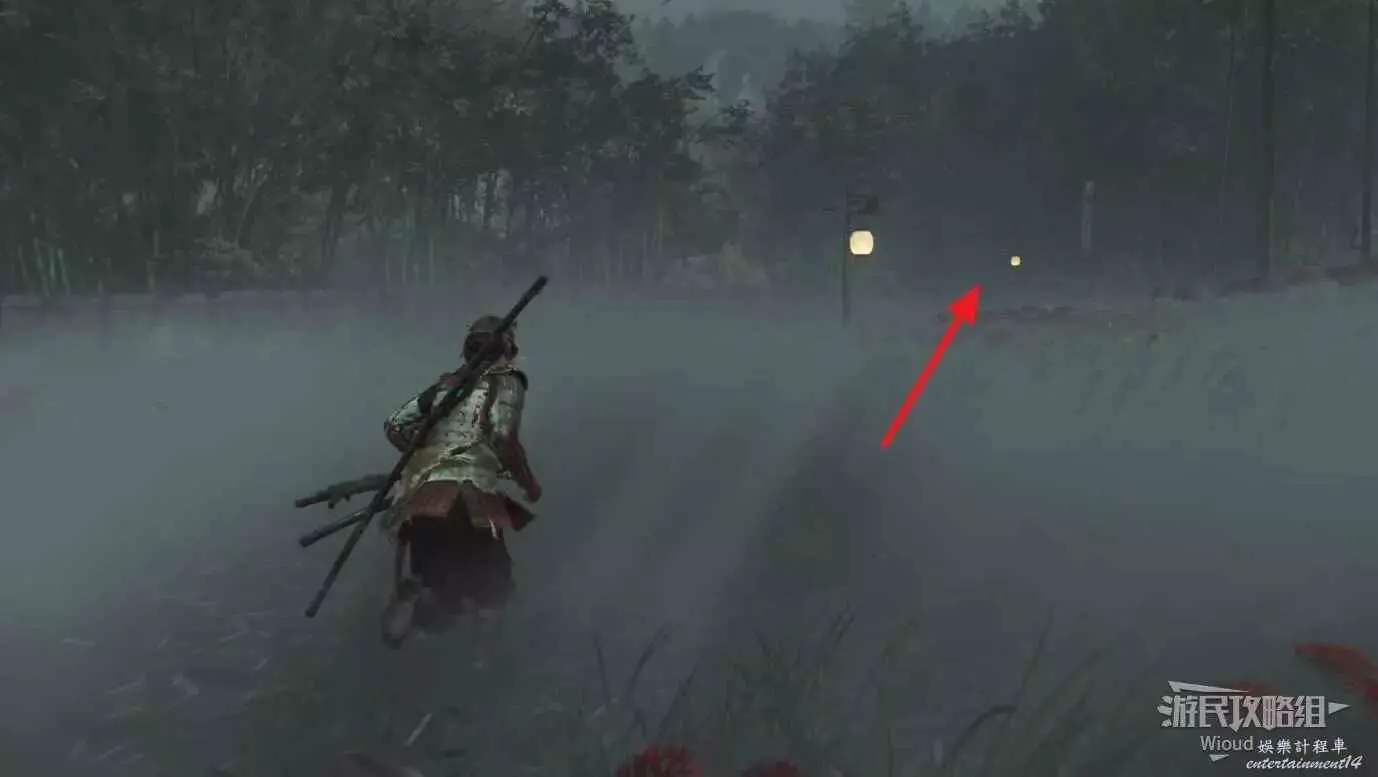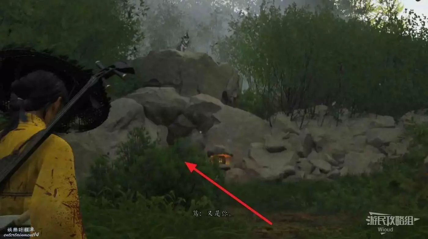 到達營地和說書人對話,然後擊敗前面的熊,拾取掛在樹上的風鈴。