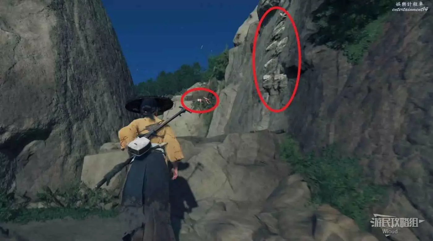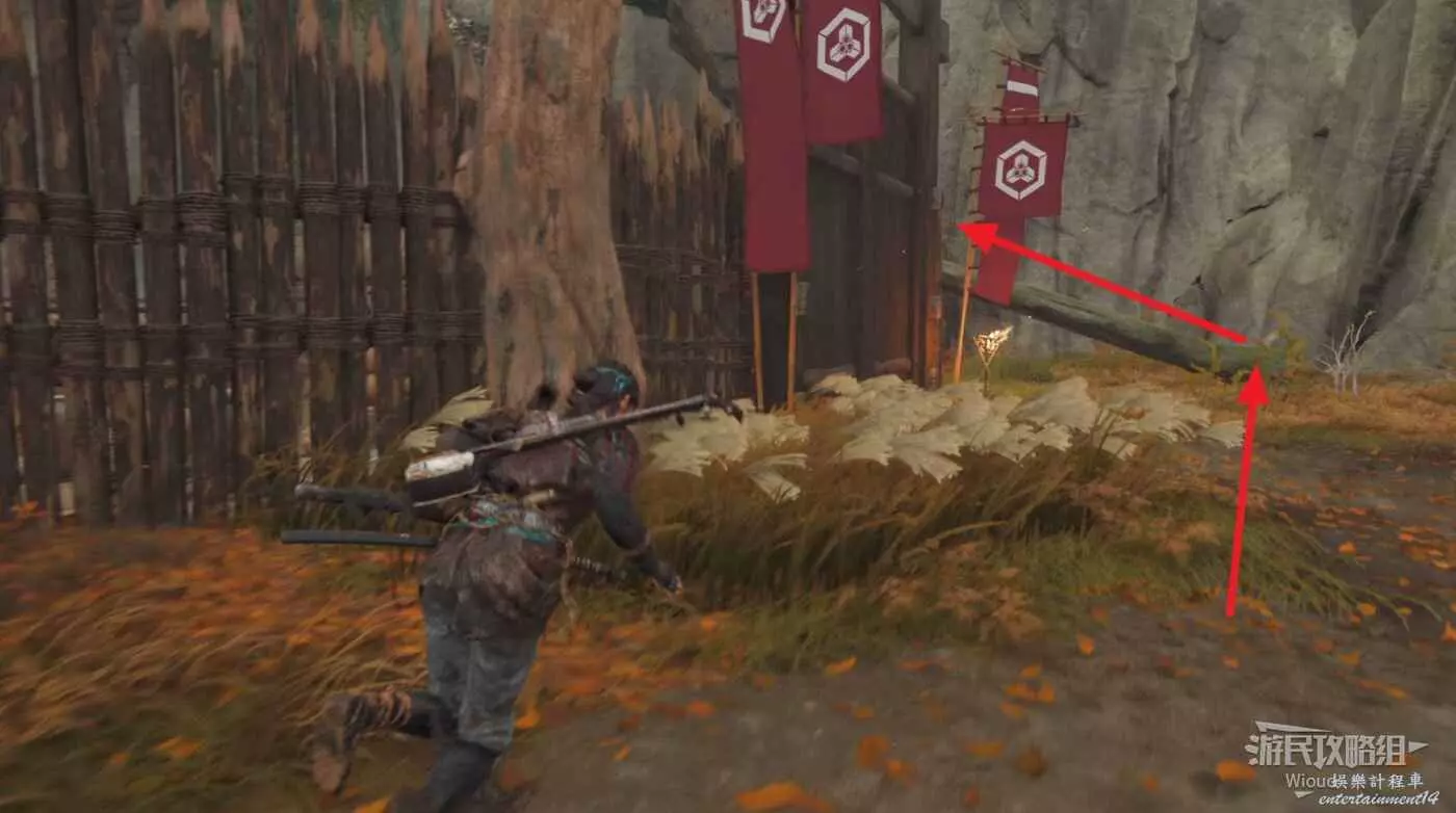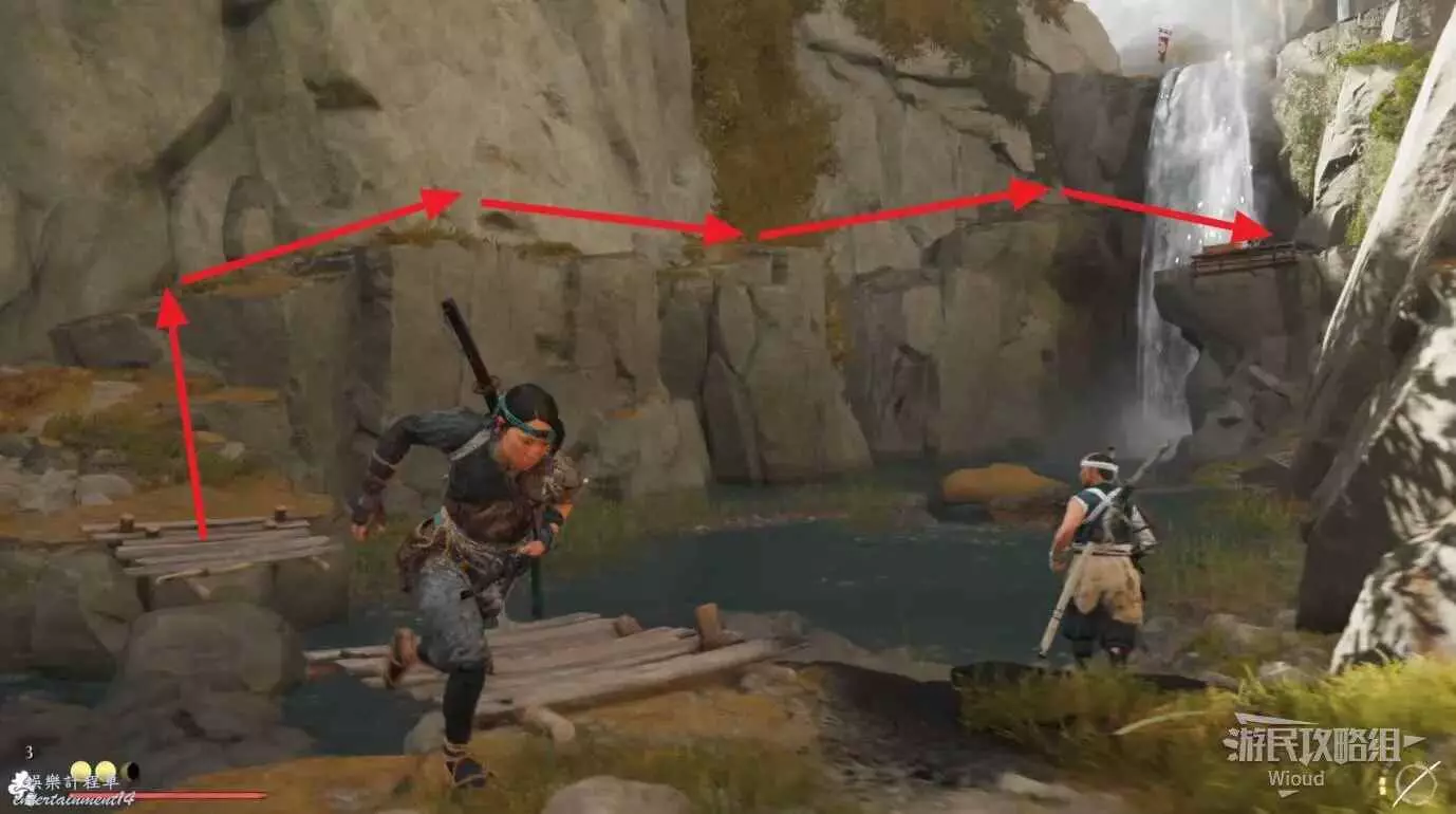 牆上帶有白色印記的石頭可攀附,遠處帶有紅色絲帶的樹枝可用鉤爪直接跳過去。