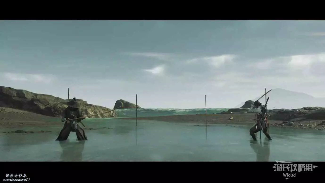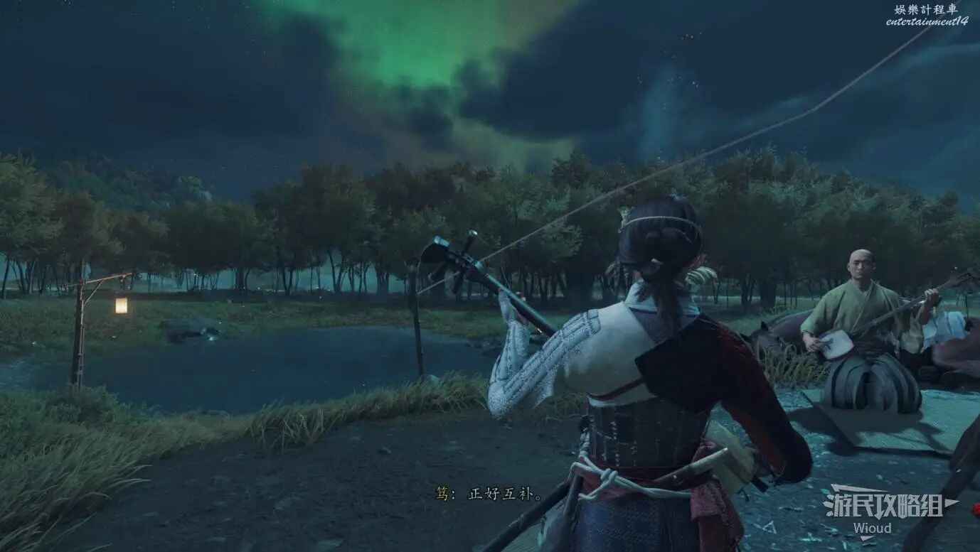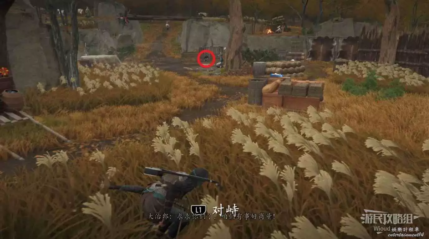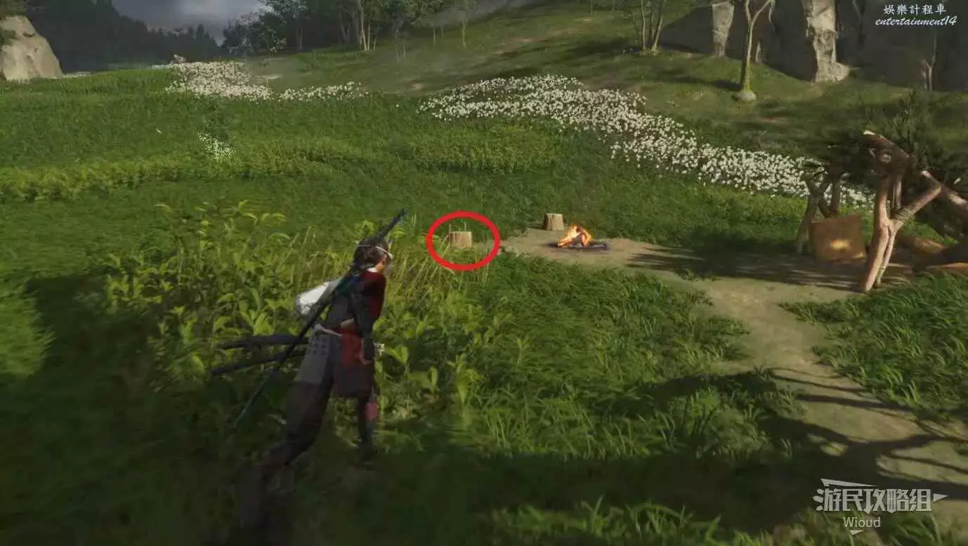 跟此處營地旁邊的木樁子互動,等武藏過來和他一起走到決鬥場地。