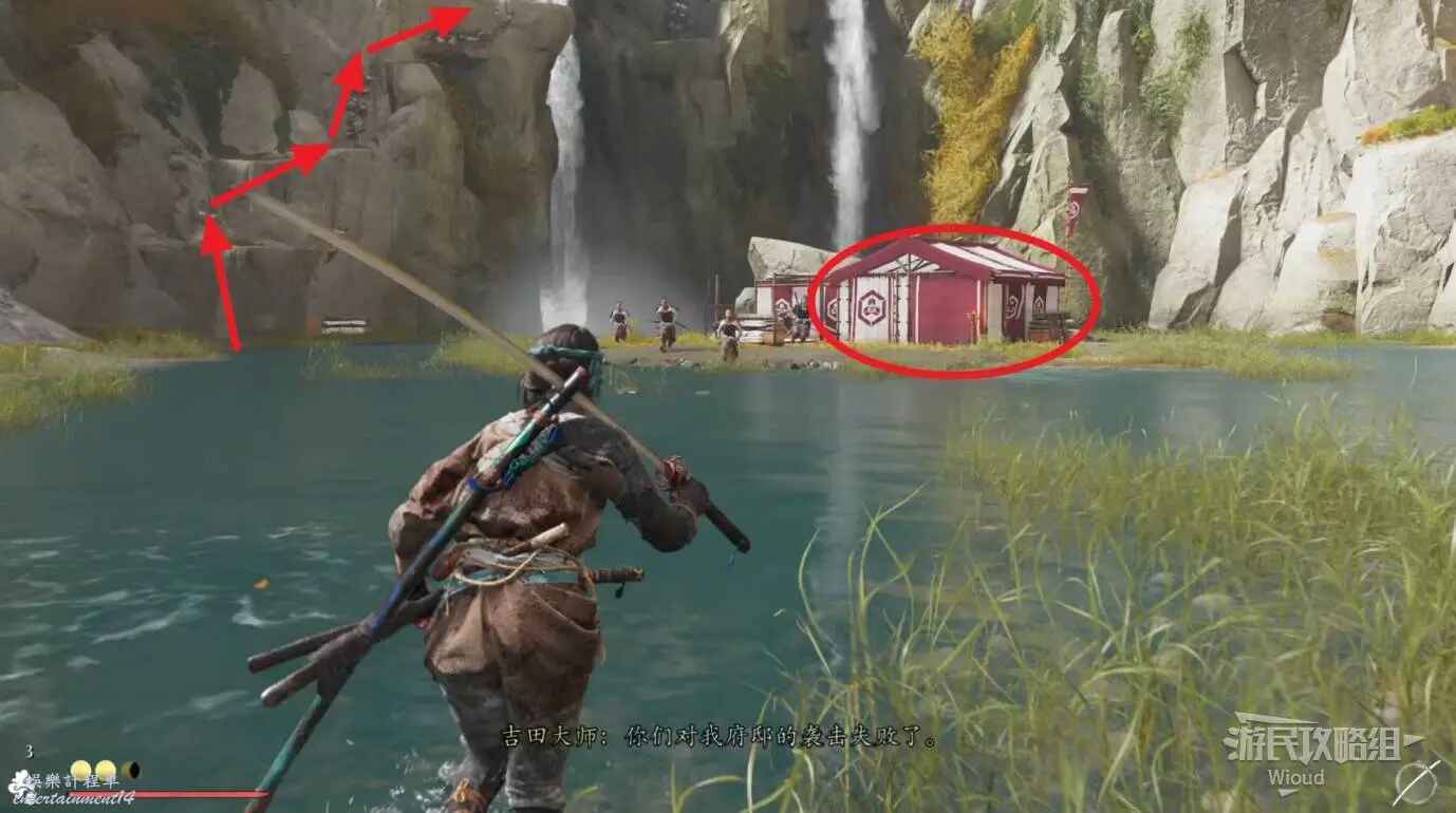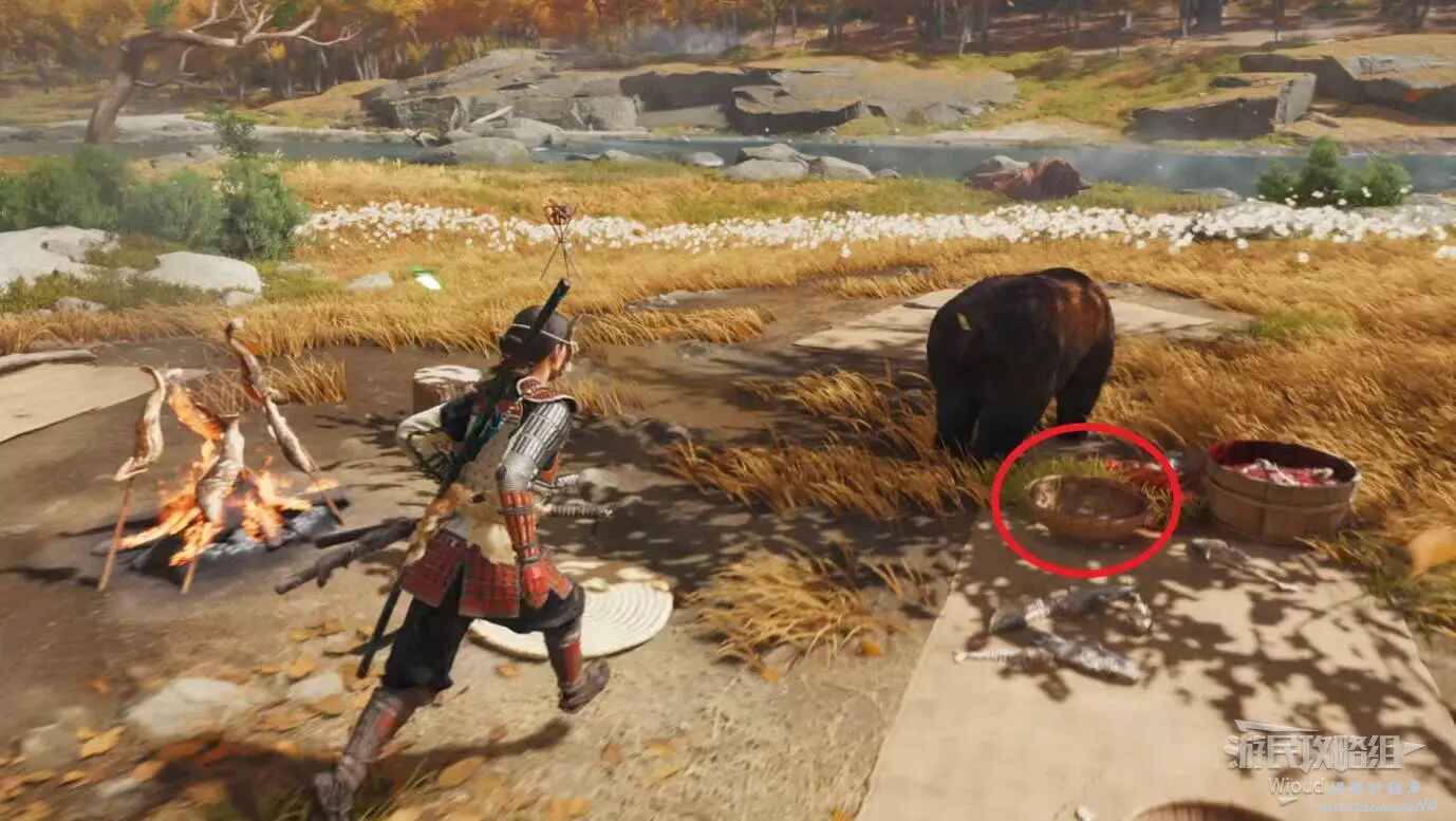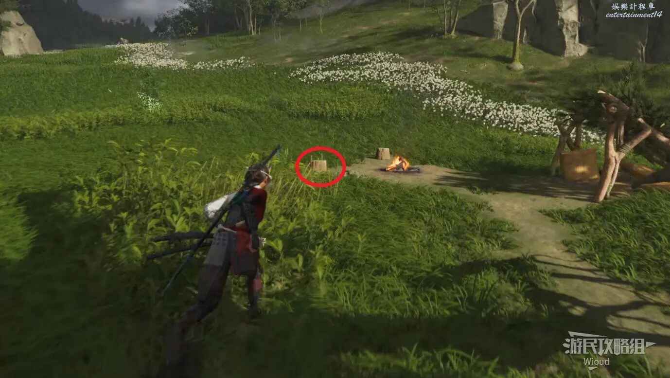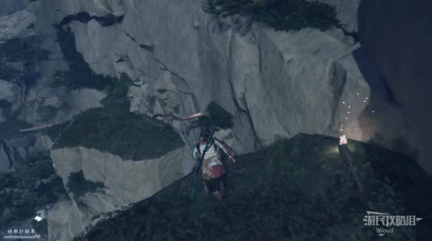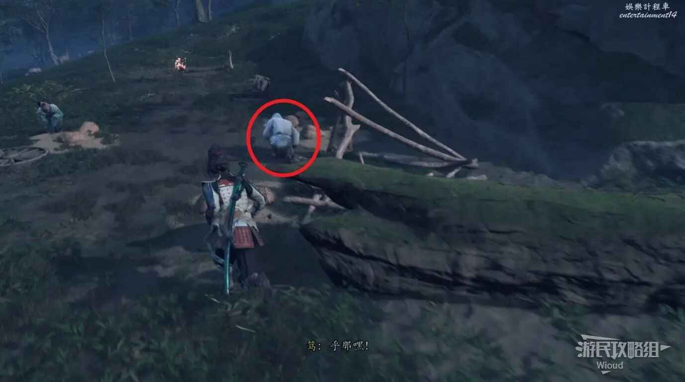 將敵人全幹掉,過完劇情點燃旁邊篝火,然後爬到後面和大治郎互動。