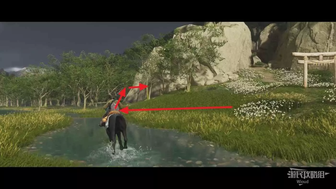 神社入口可直接看到水墨的石頭,互動獲得【荒野頭帶】。
