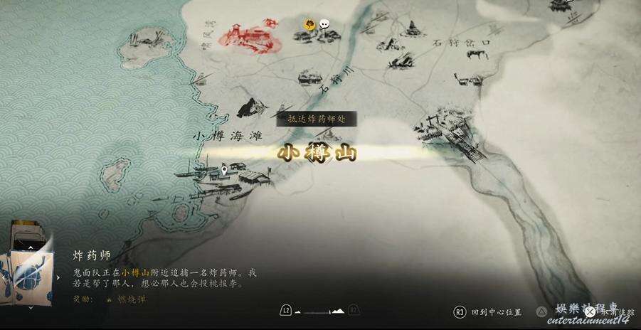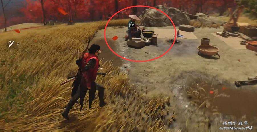 從旁邊的下坡滑下去,和對面帶斗笠的NPC對話,走到他正面和畫互動,選擇【瘋子】得到三個水墨的位置。