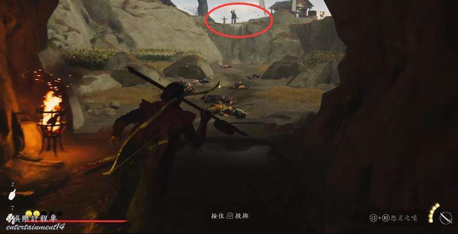跟著NPC走出洞穴,朝門口的敵人扔致盲彈,出去幹掉他們。