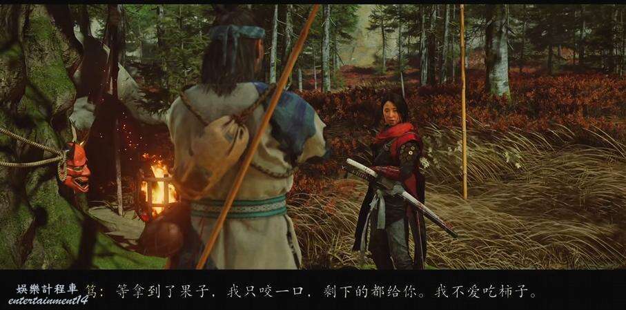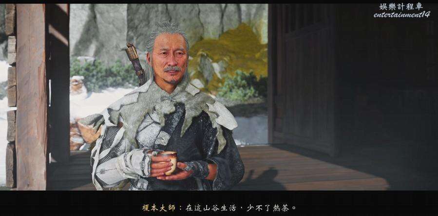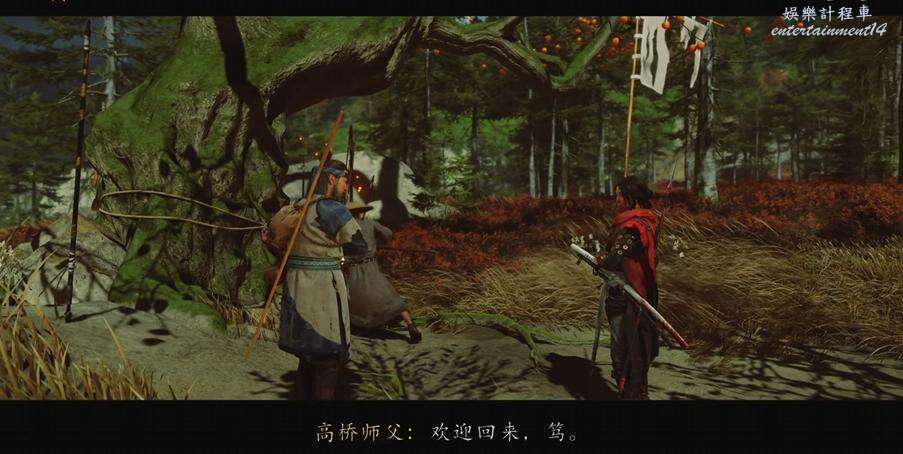 到達營地和站在房屋前的弟子對話,得知師傅在房屋對面的柿子樹下。