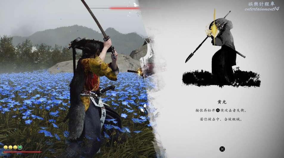 當敵方使用黃光時,按住重擊再出刀會使其失衡,反之被打中則會被繳械。