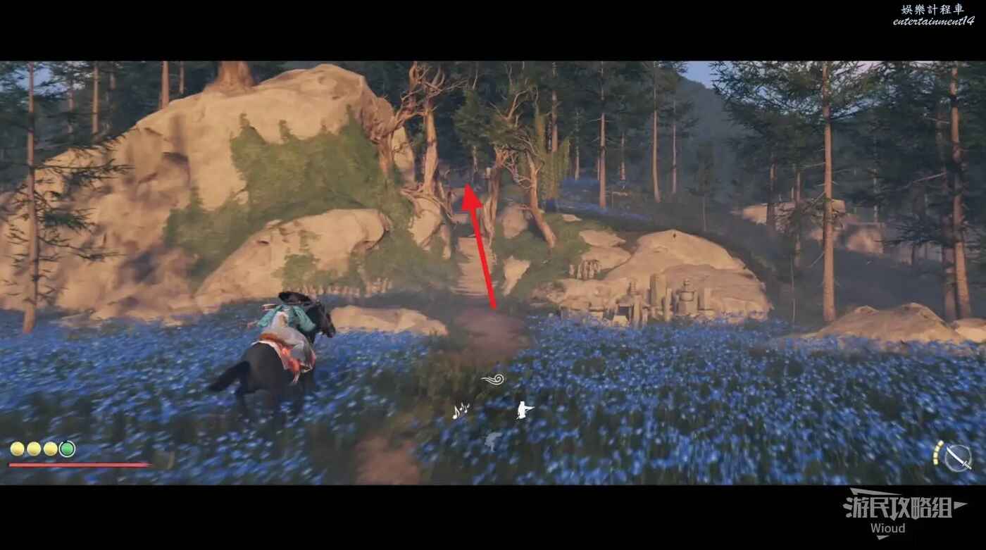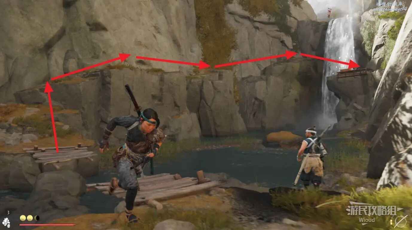 牆上帶有白色印記的石頭可攀附,遠處帶有紅色絲帶的樹枝可用鉤爪直接跳過去。
