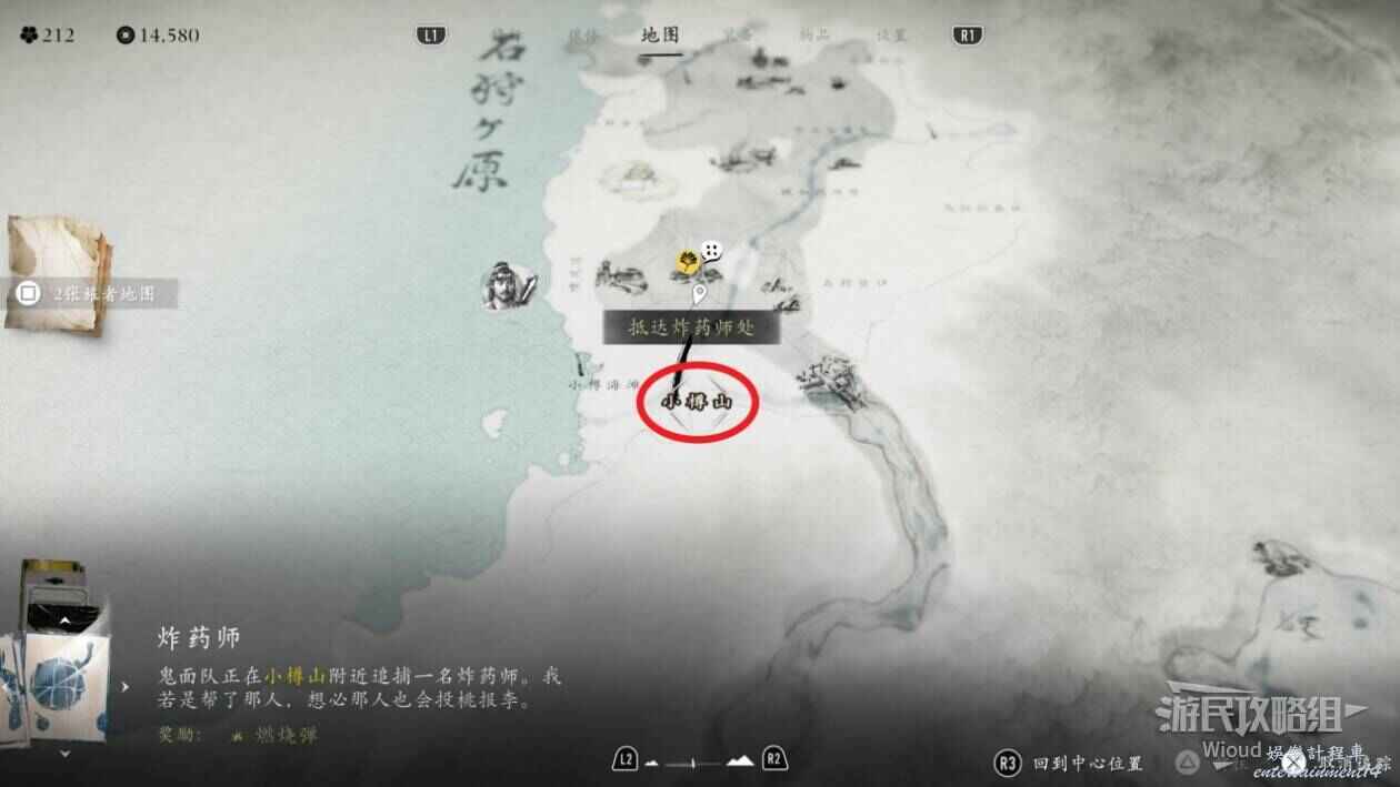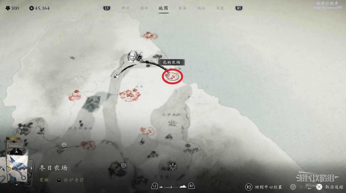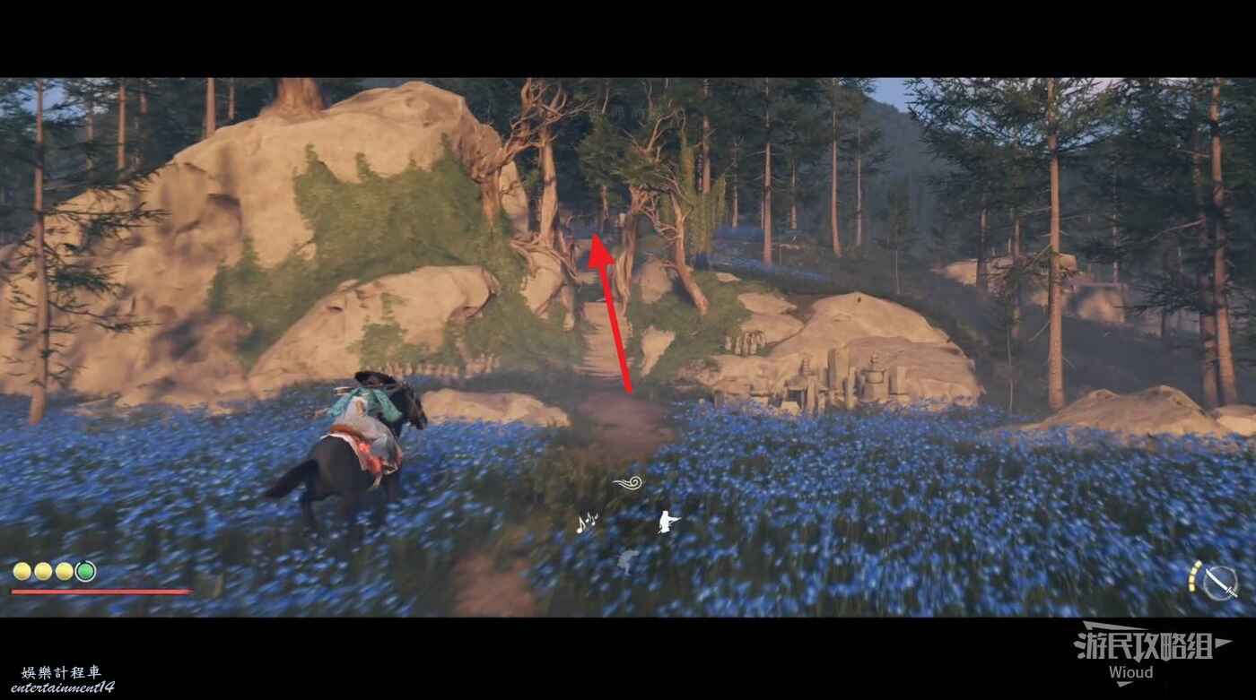 往地圖左下角指引區域移動,跟著白色花叢往山上走。