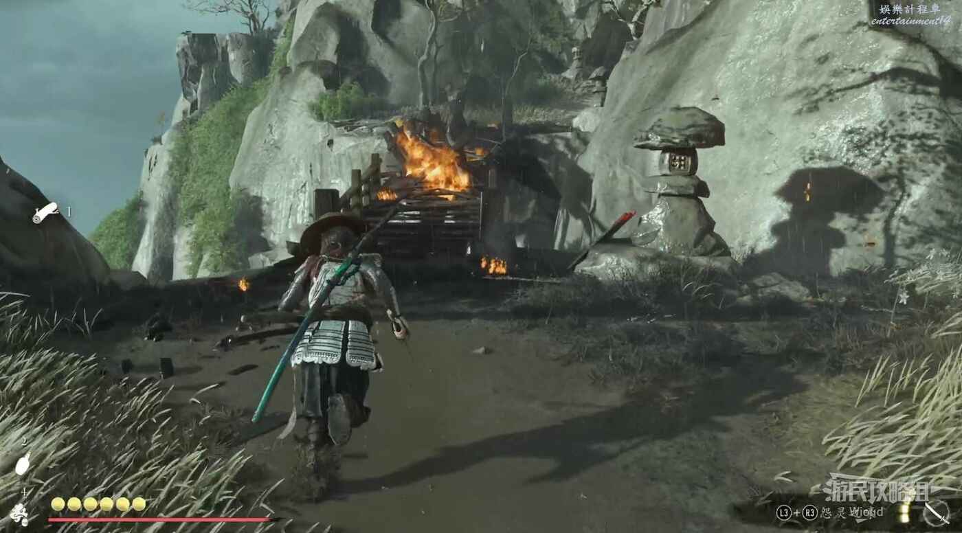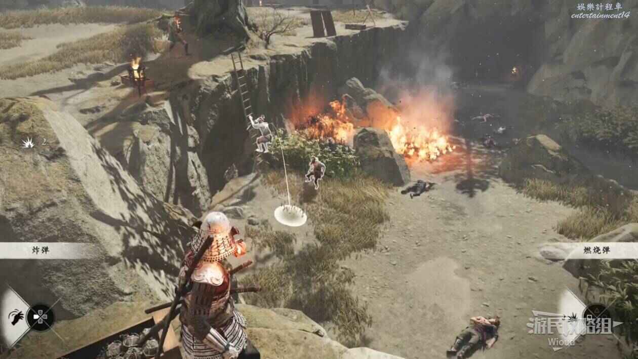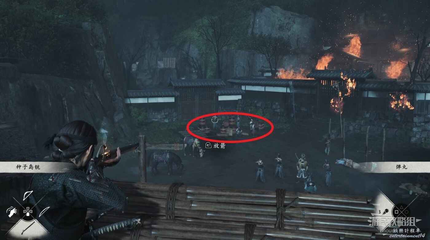 用火銃射擊遠處的炸藥桶,然後下去把敵人全幹掉觸發劇情,原來十兵衛已經有女兒了,這次就是為了救女兒過來的。