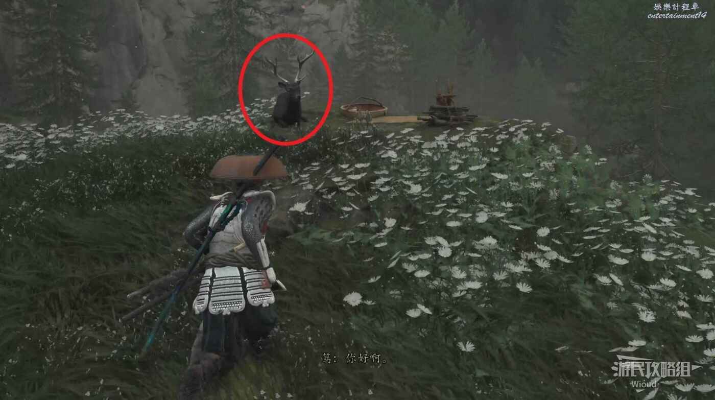 不遠處遇到一個黑鹿,跟著黑鹿爬一段攀附點,找到一個營地,和裡面的NPC對話。