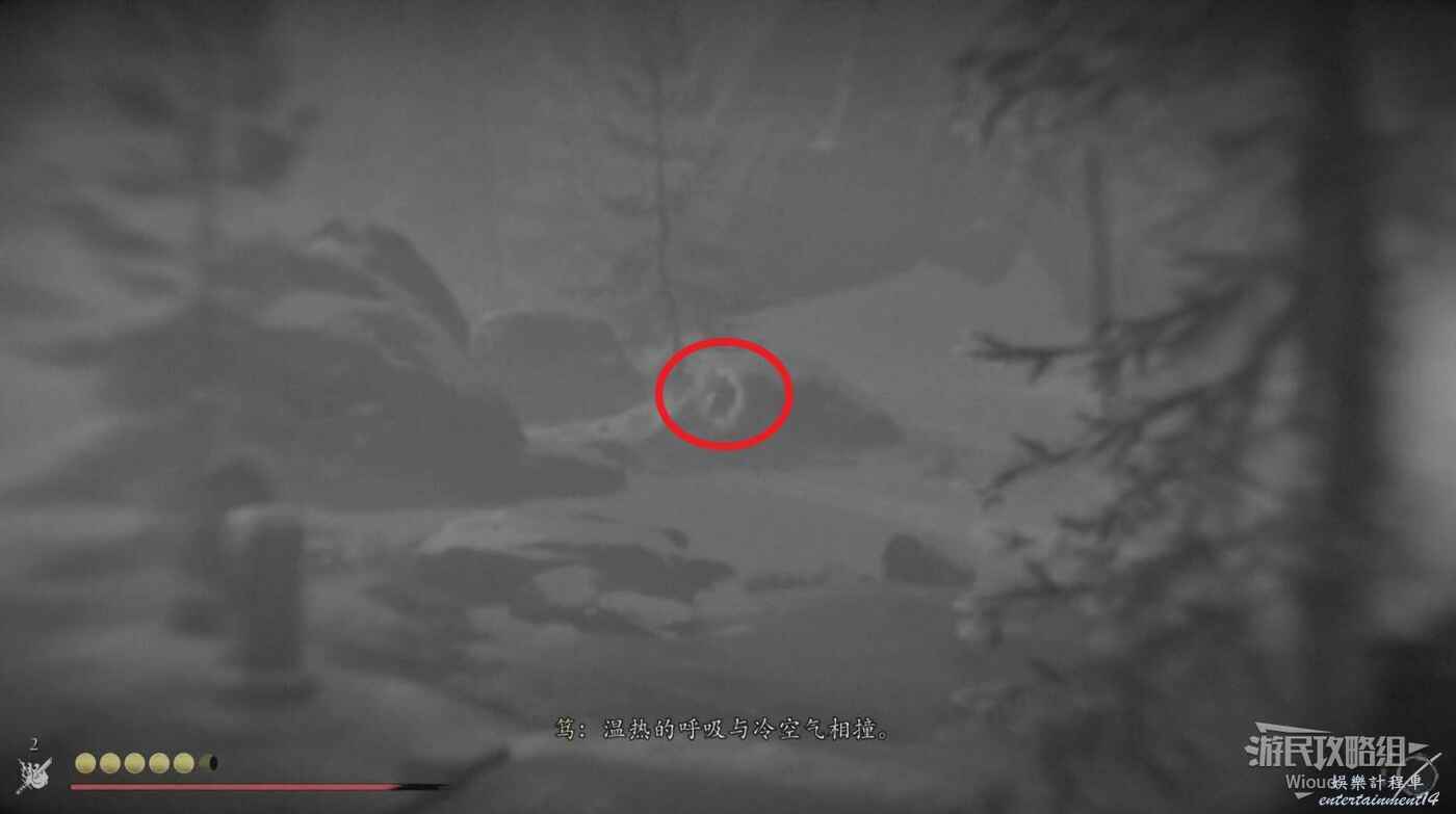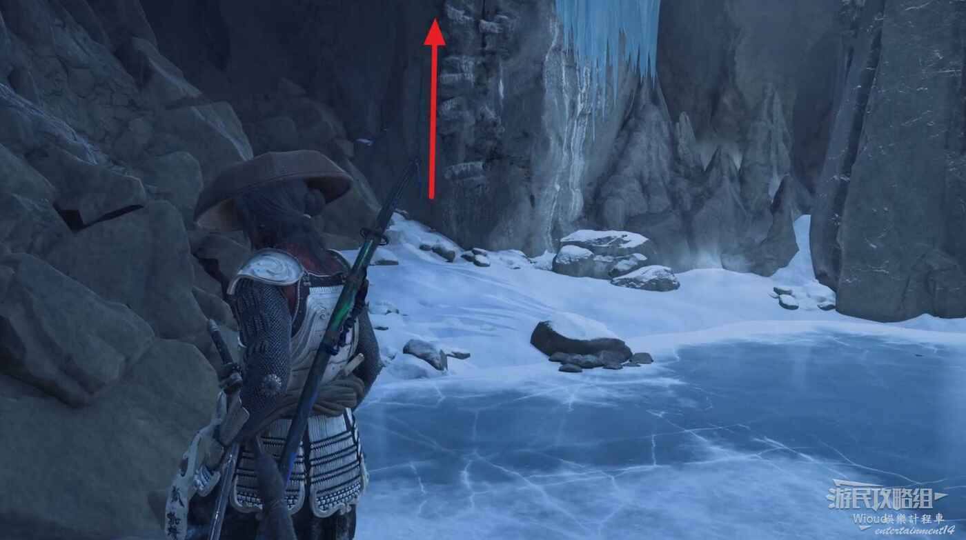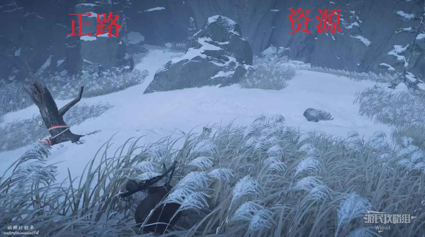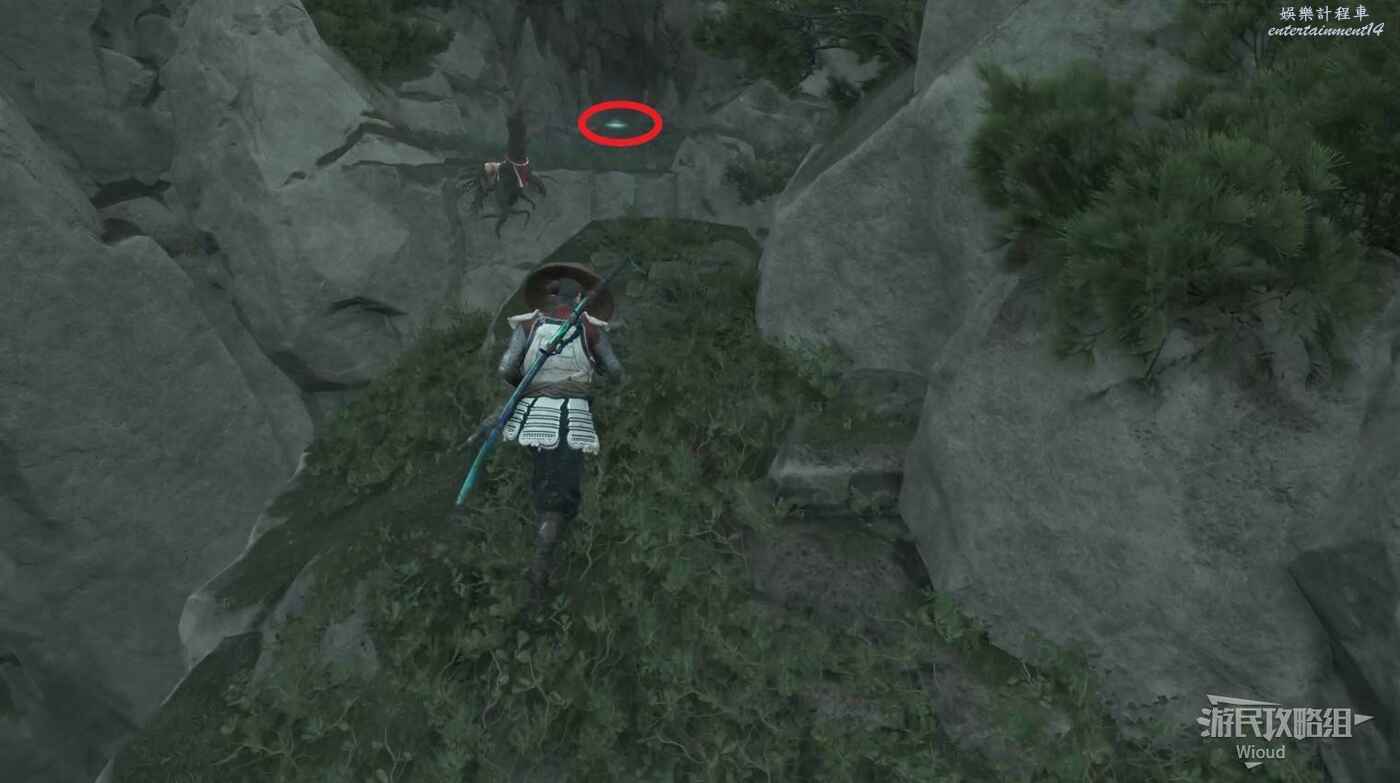 不遠處會看到一棵突兀的樹,樹旁拾取武器,然後爬左前方的攀附節點。