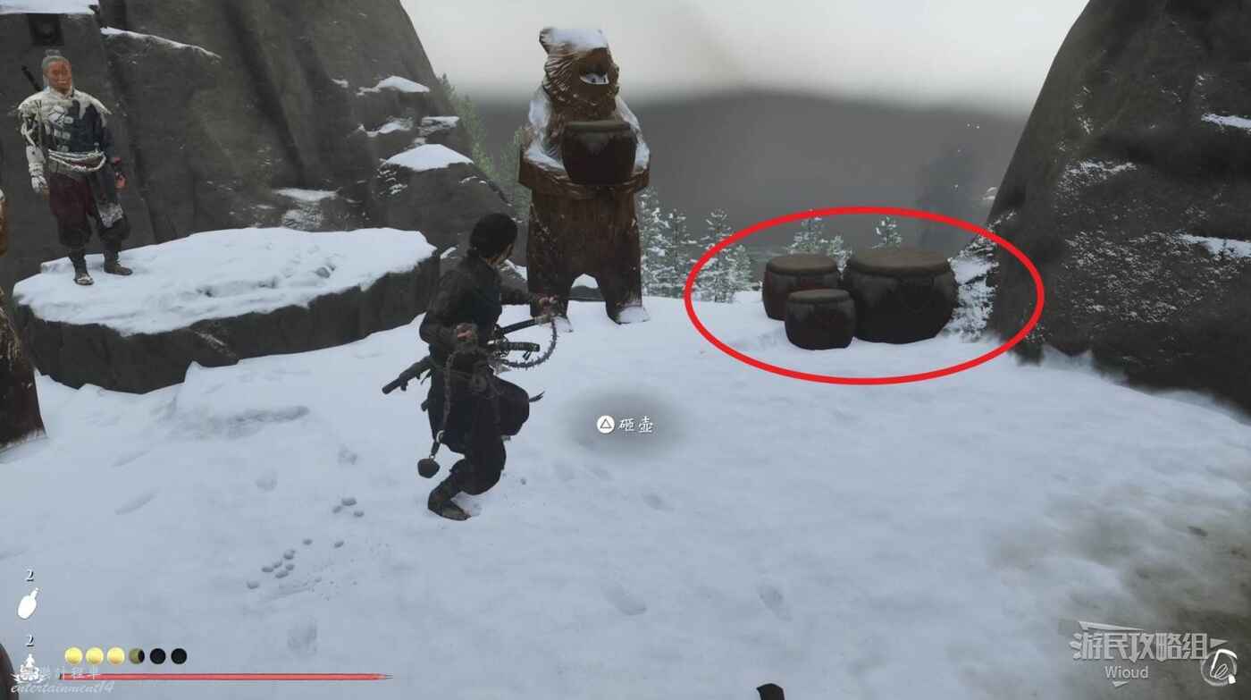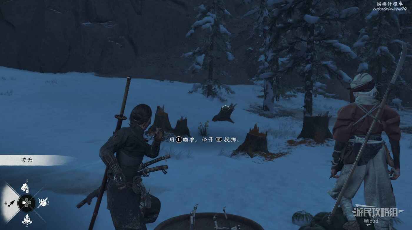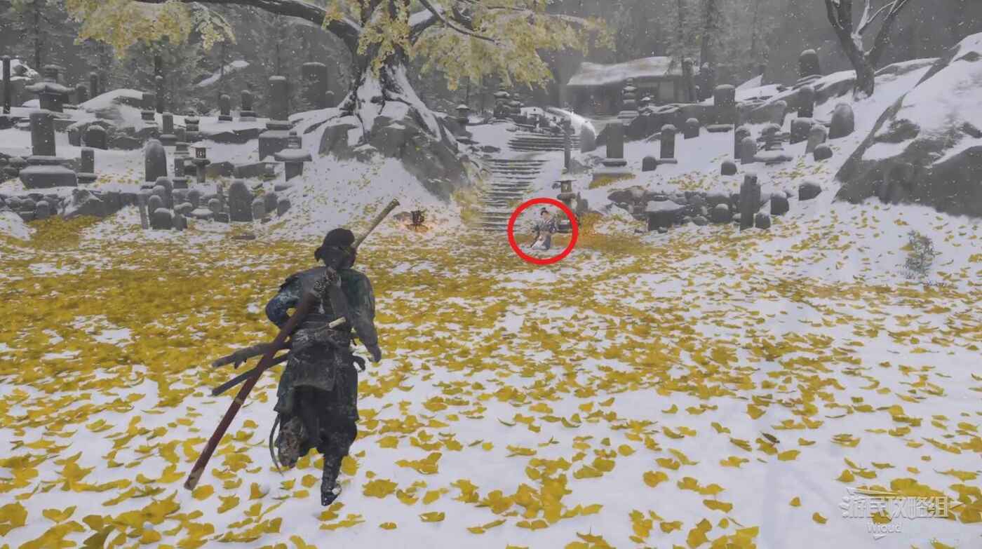 出去隨著劇情祭拜一下,然後跟阿雪走到一堆敵人前,這時獲得新的武器煙霧彈。