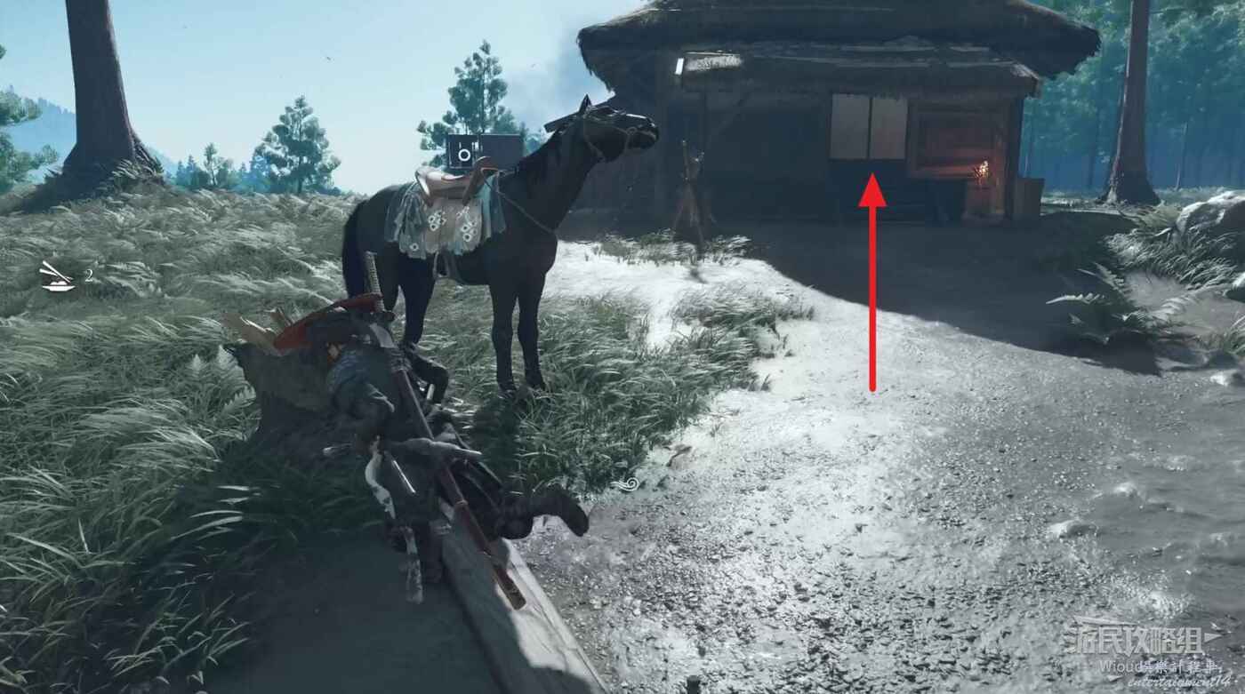 看到一個小屋後,繞到另一面進入小屋,和門口的刀鞘互動觸發劇情。