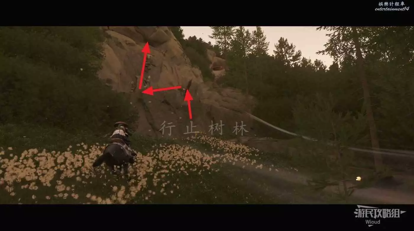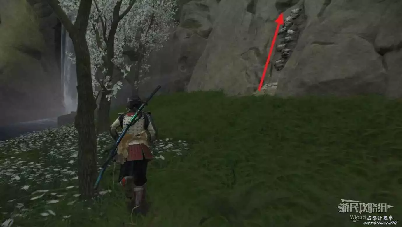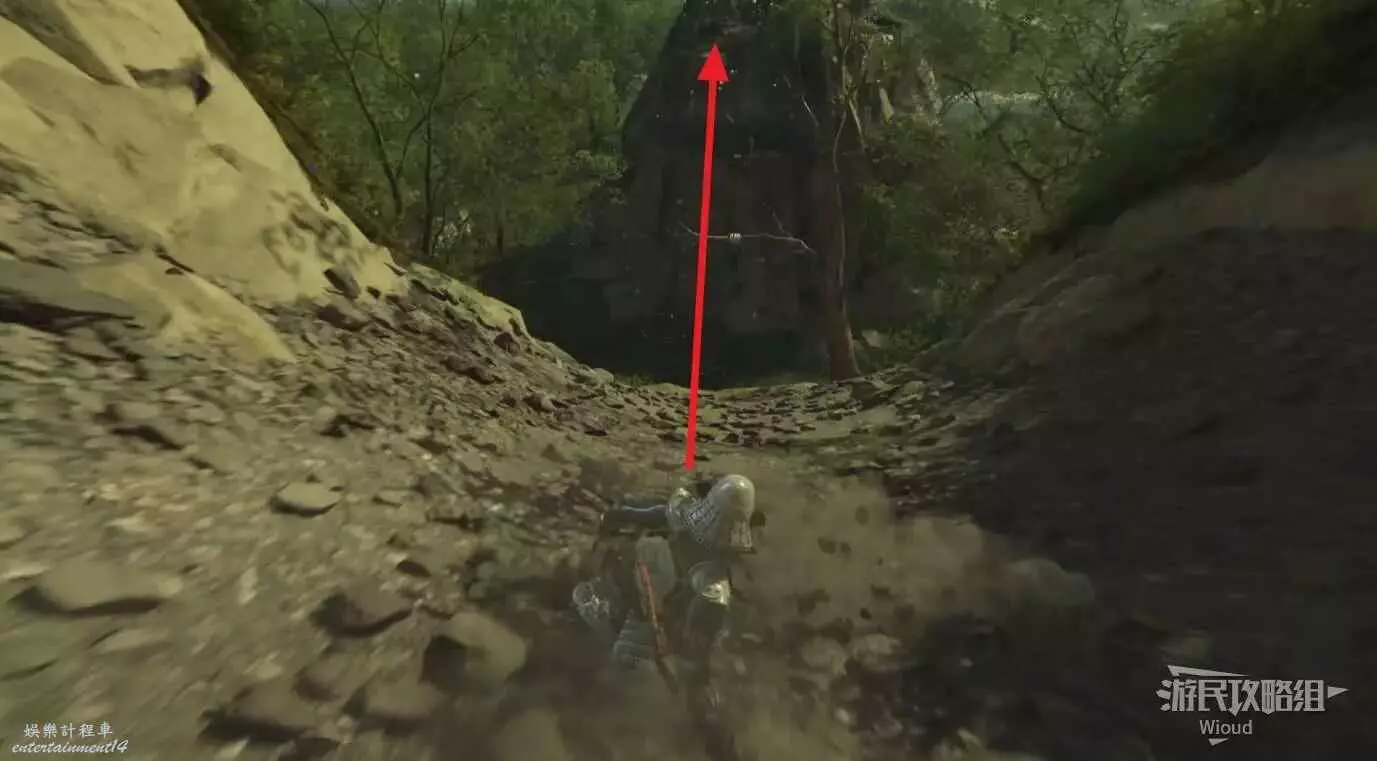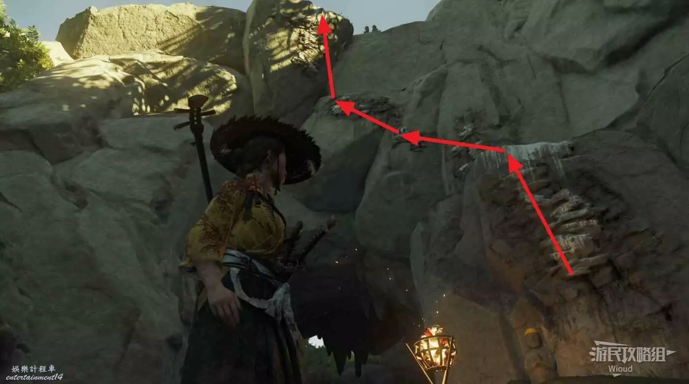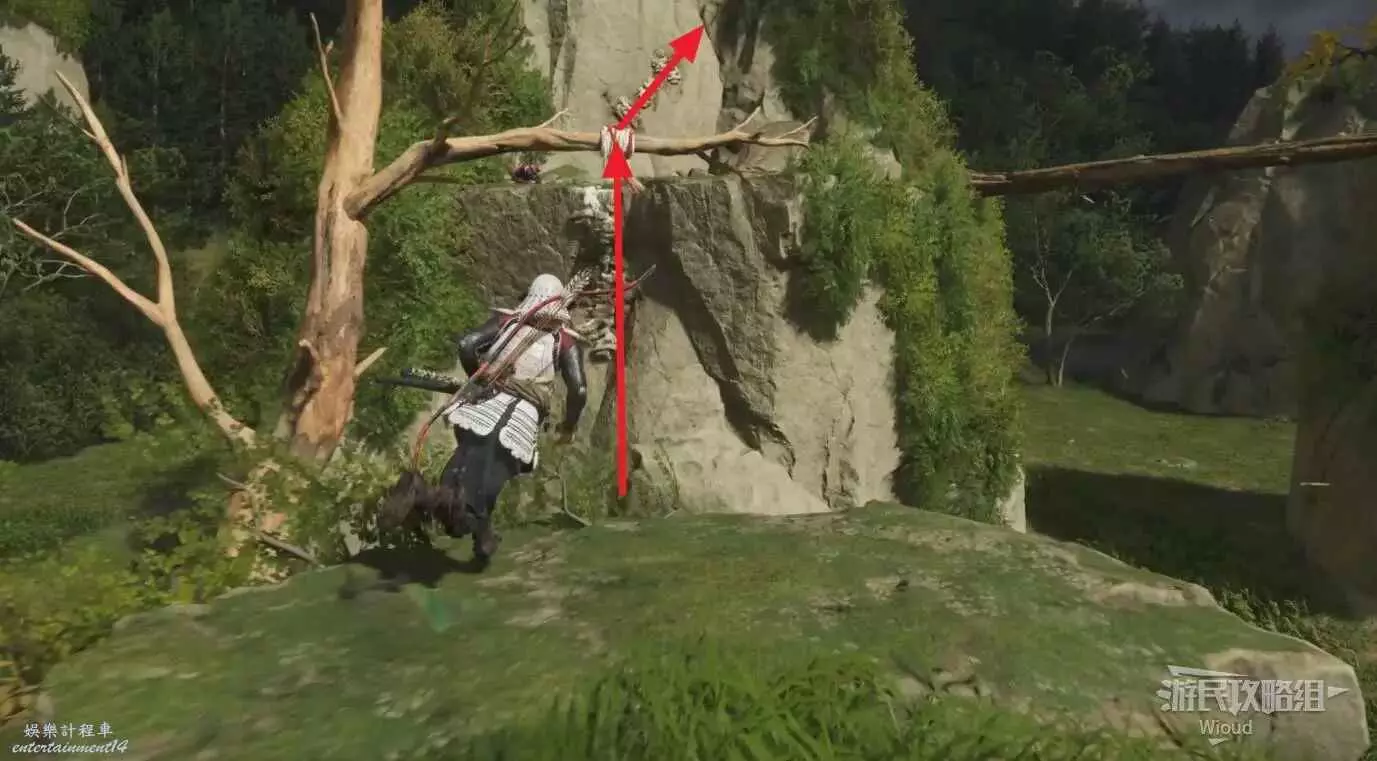 走到目的地沿著下圖路線所示方向,沿著攀附節點逐級爬上去即可找到祭壇。
