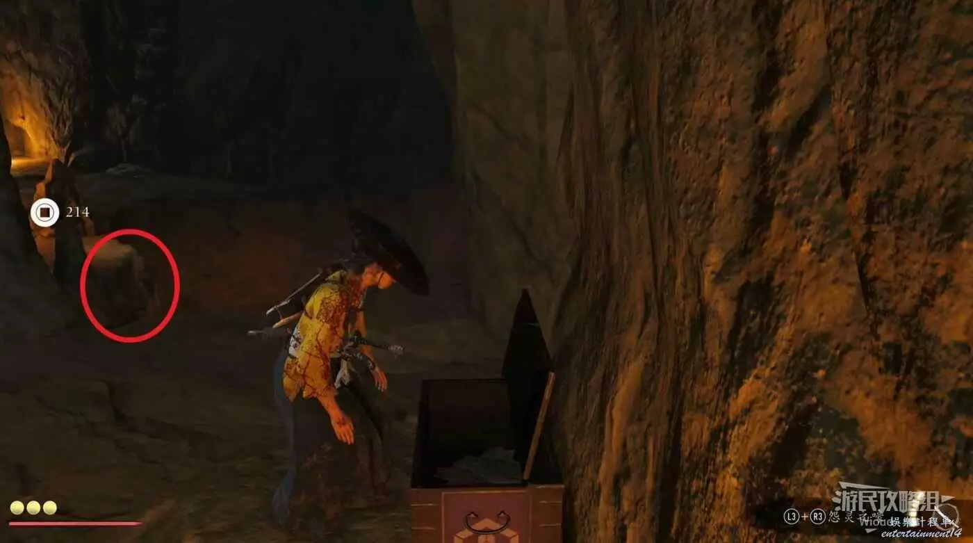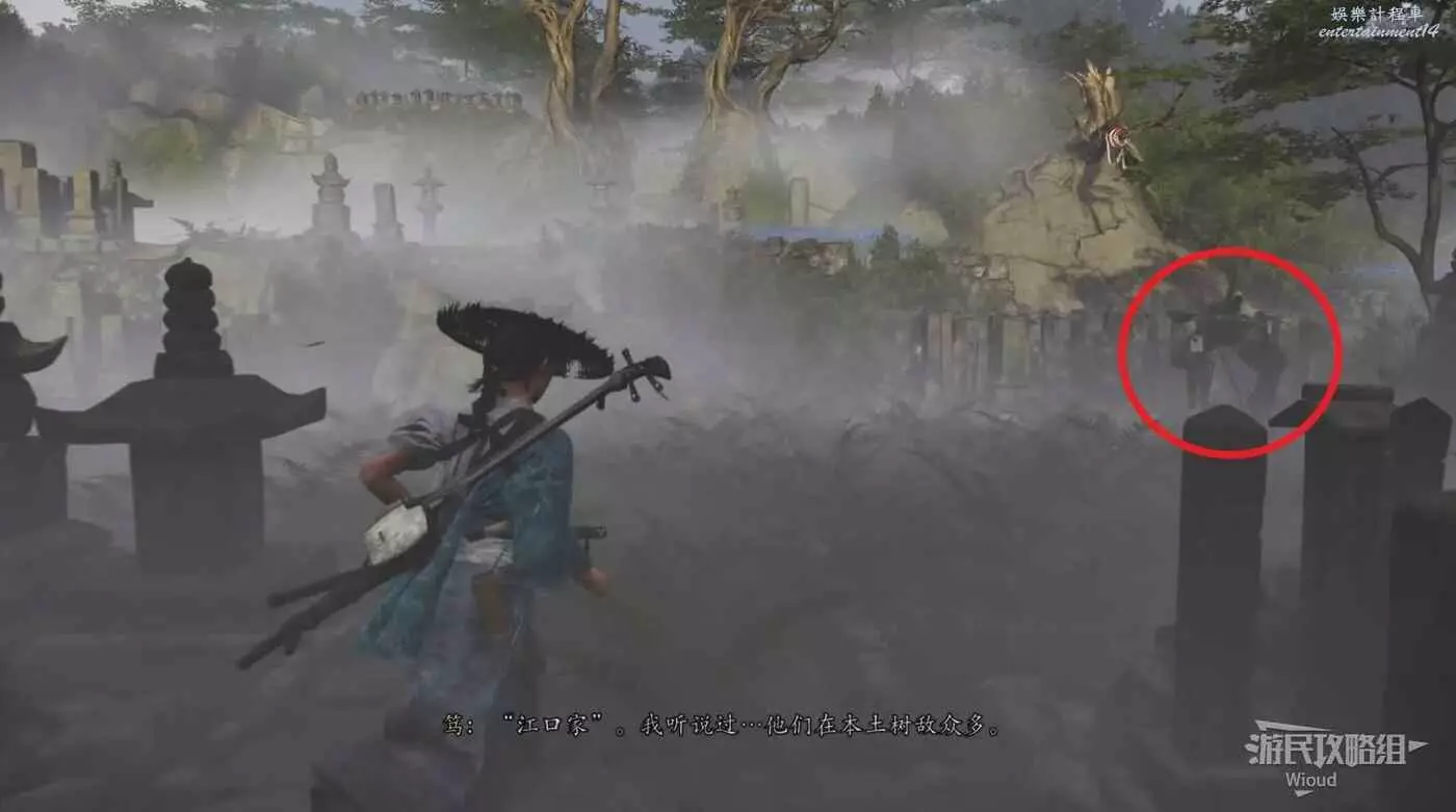 目的地沿著樓梯進入墓園,穿過一道門和右邊屍體互動,此時一個同樣接取懸賞的浪人進來和我們戰鬥。