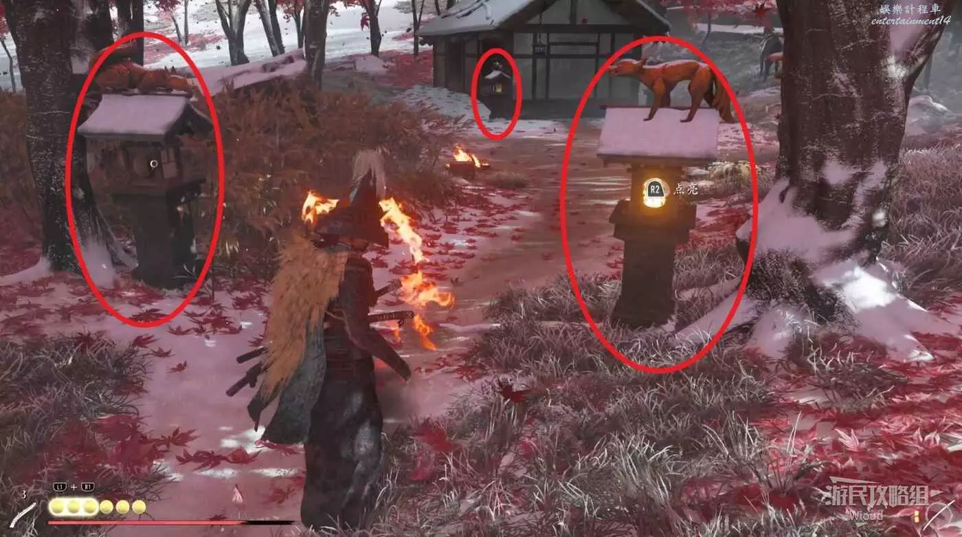 走到目標建築前,拿著火把點燃下圖三個燈,打開門啟動裡面祭壇即可。