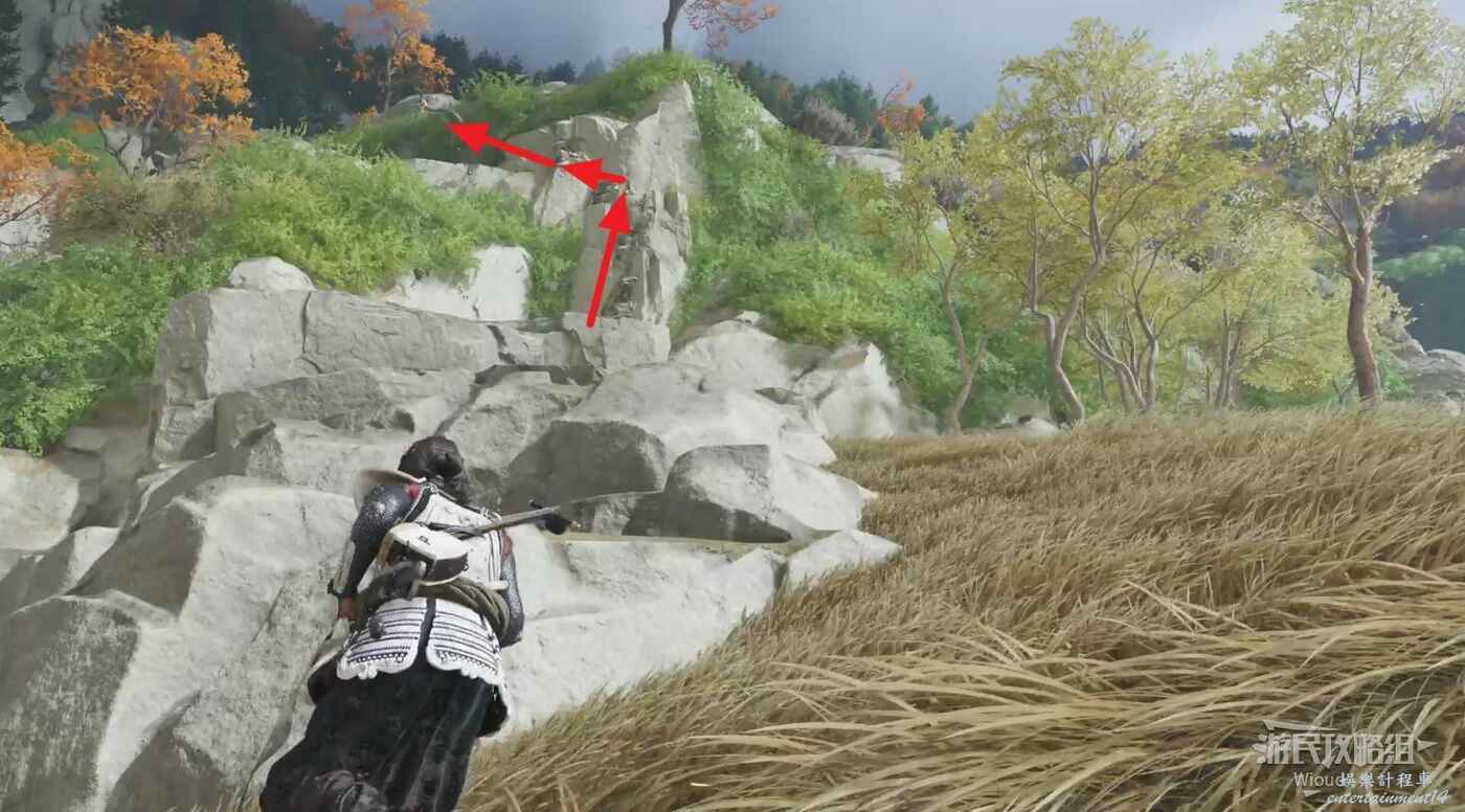 來到目的地,發現祭壇在獨立的石柱上,注意石柱旁邊的高地,貼著高地底部邊緣走,有個可以往上爬的節點。