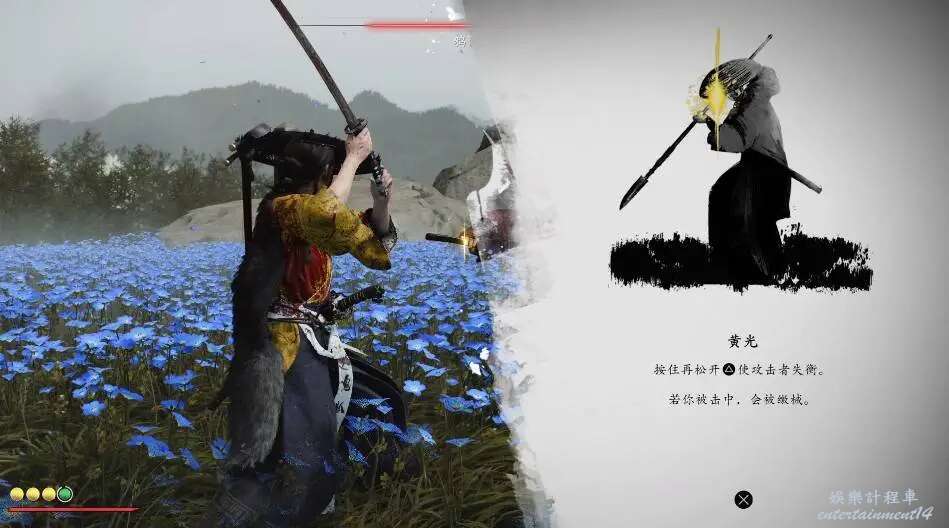 當敵方使用黃光時,按住重擊再出刀會使其失衡,反之被打中則會被繳械。