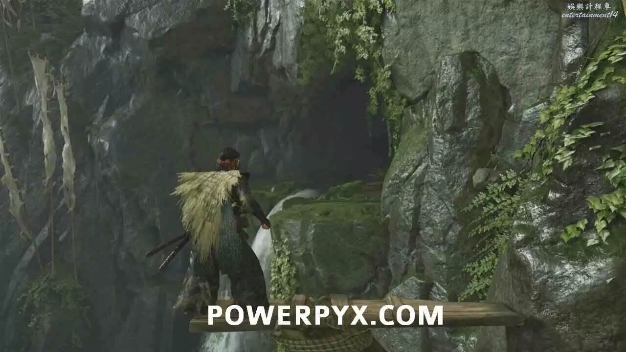 爬上岩壁,利用木板跳向洞穴。進洞之後沿路走到盡頭,爬過狹窄通道。