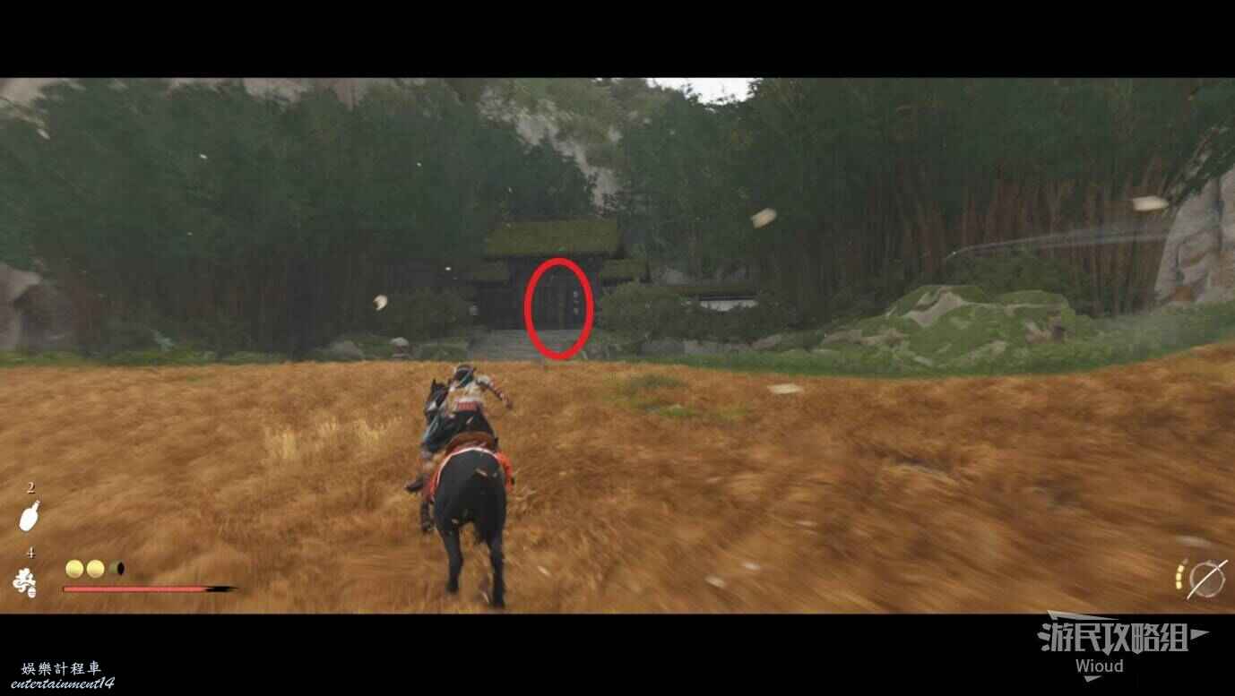 注意右側紅圈所示的塔樓,移動到這個塔樓的右側面。