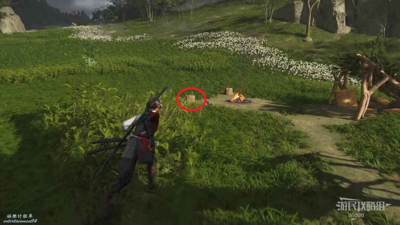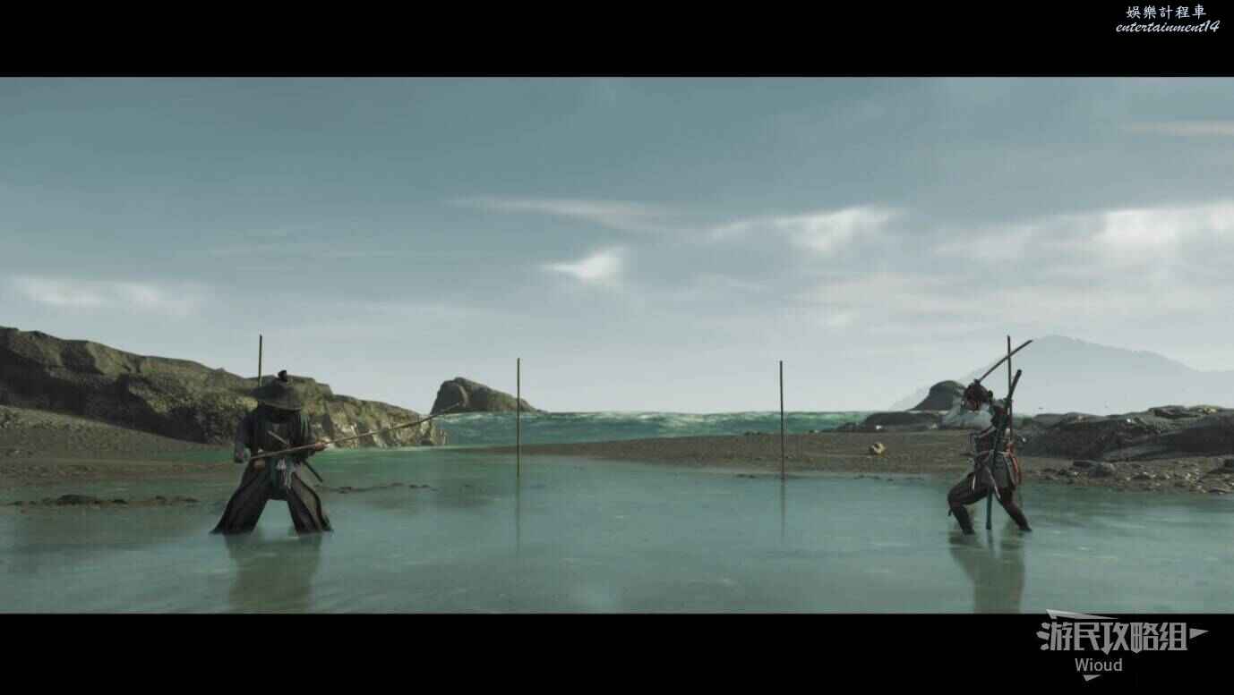 跟此處營地旁邊的木樁子互動,等武藏過來和他一起走到決鬥場地。