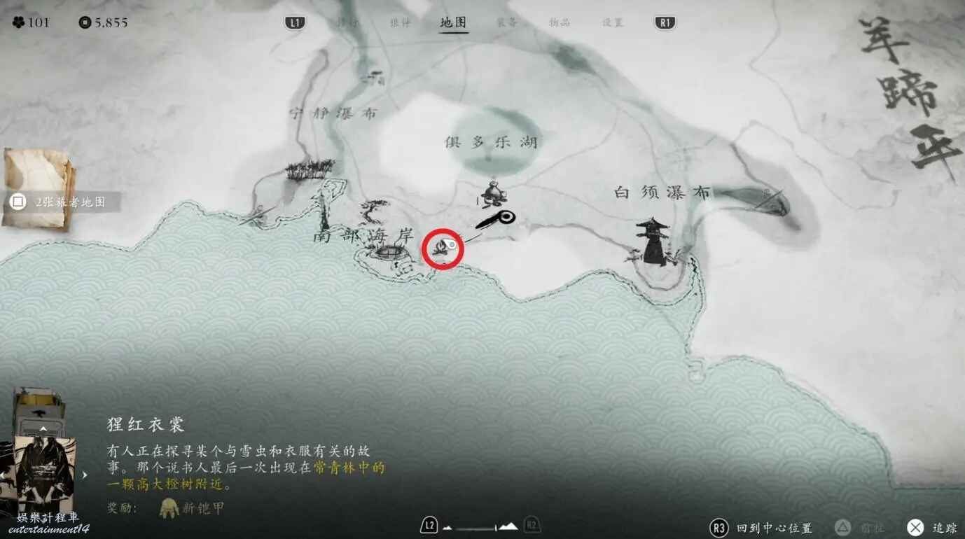 該任務的接取位置在【羊蹄草原】下方區域【南部海岸】右上方的一個營地裡。