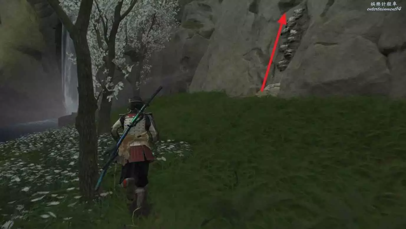 到達目的地,面對瀑布爬右側的攀附節點到山腳下,穿過一道牆縫進入羊蹄山區域。