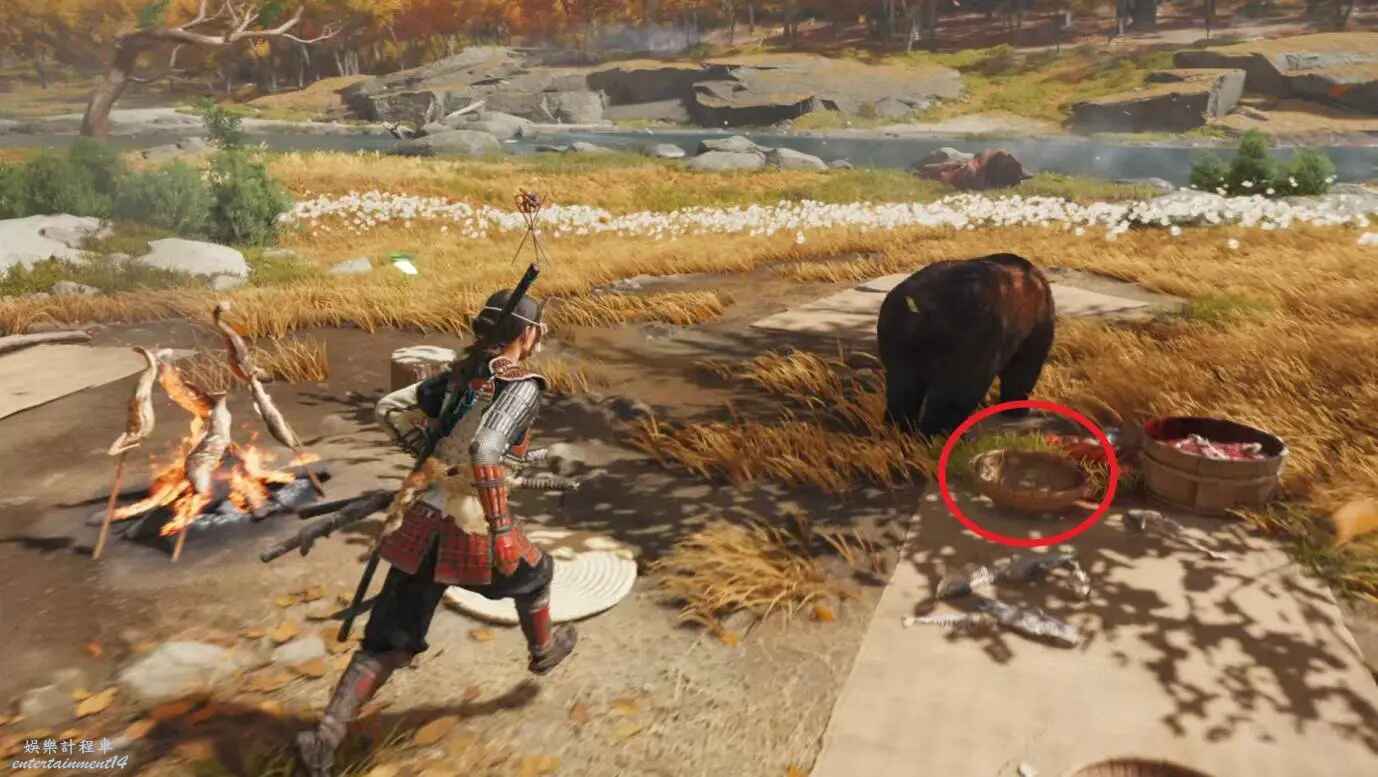 走到營地熊的旁邊,和它面前的飯盆互動兩次,喂兩次食物。
