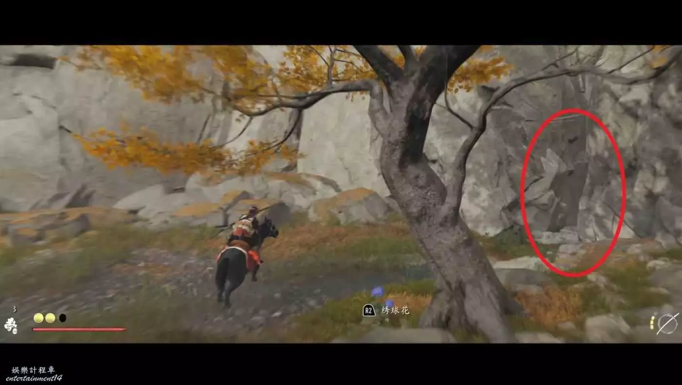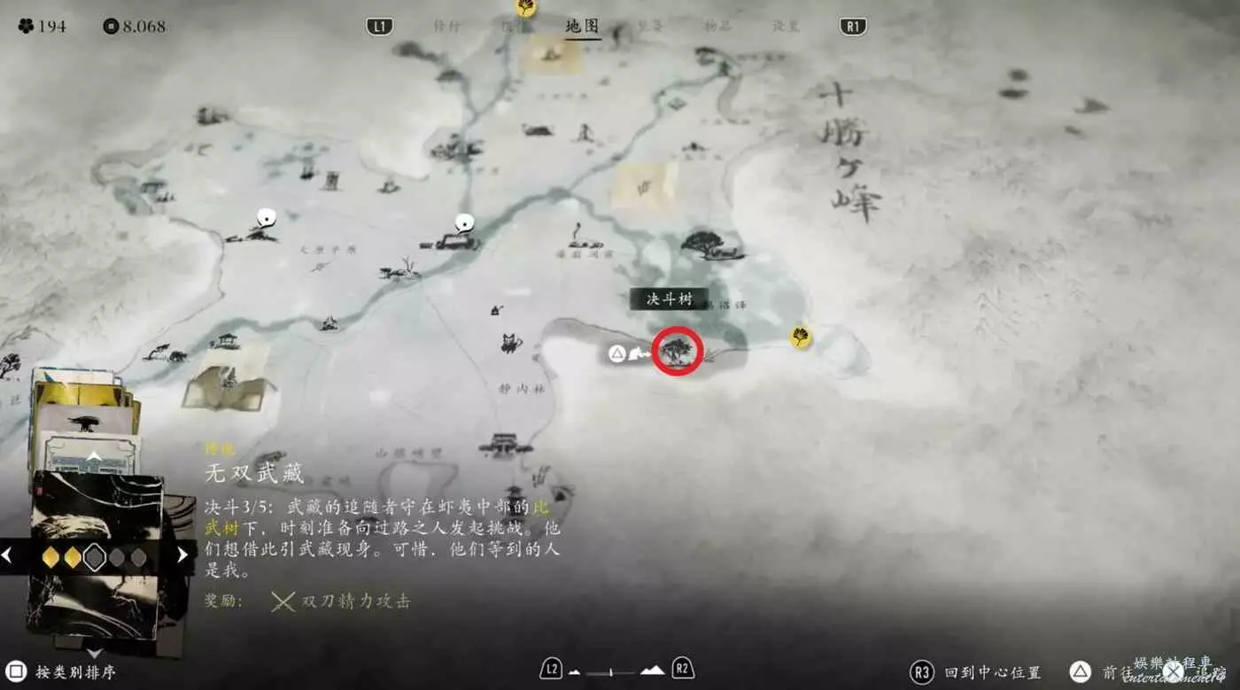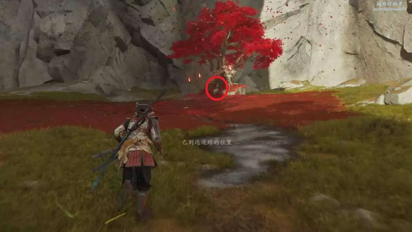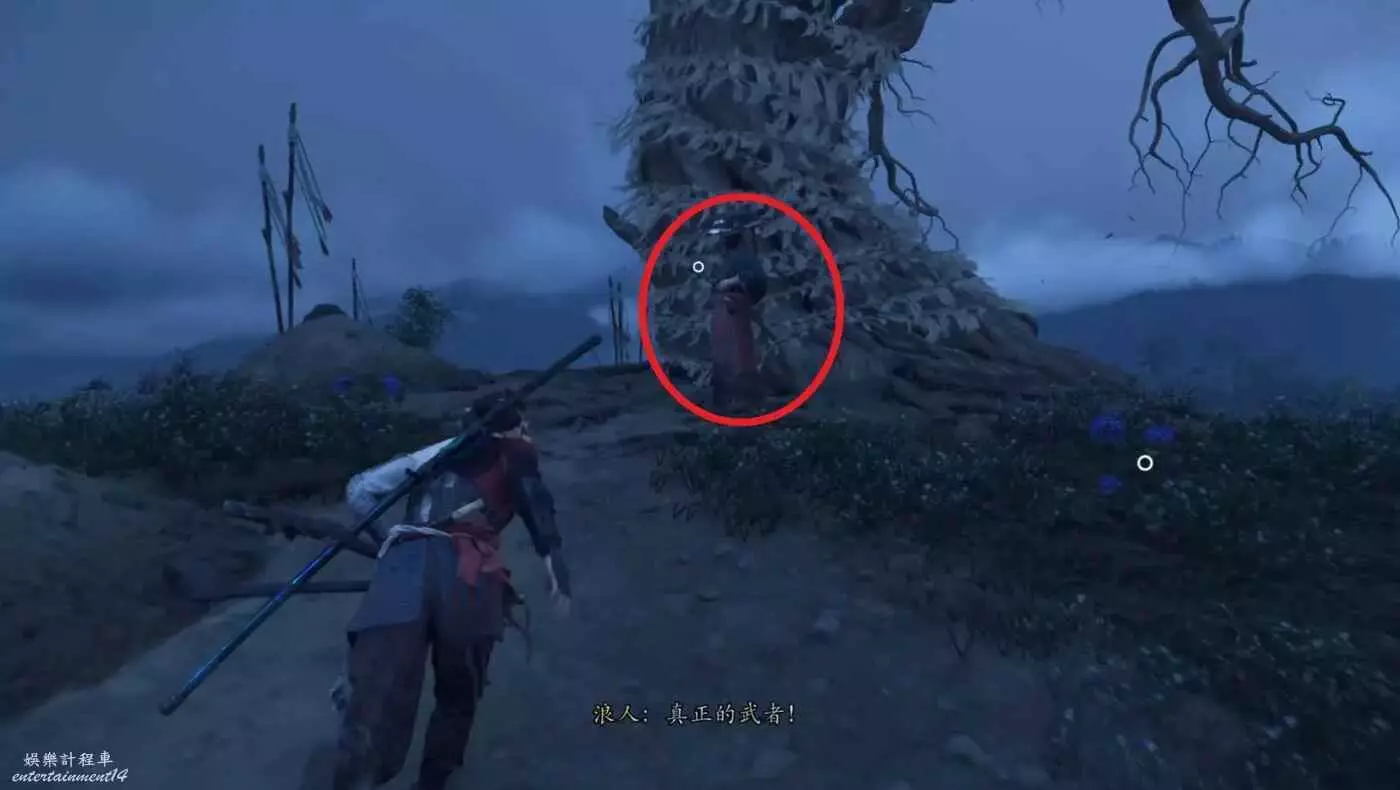 敵人就在樹下等著,靠近觸發戰鬥,將其擊敗獲得【武藏之頑抗護身符】。