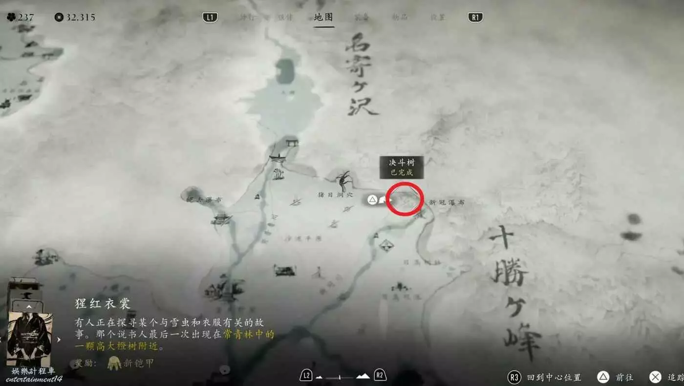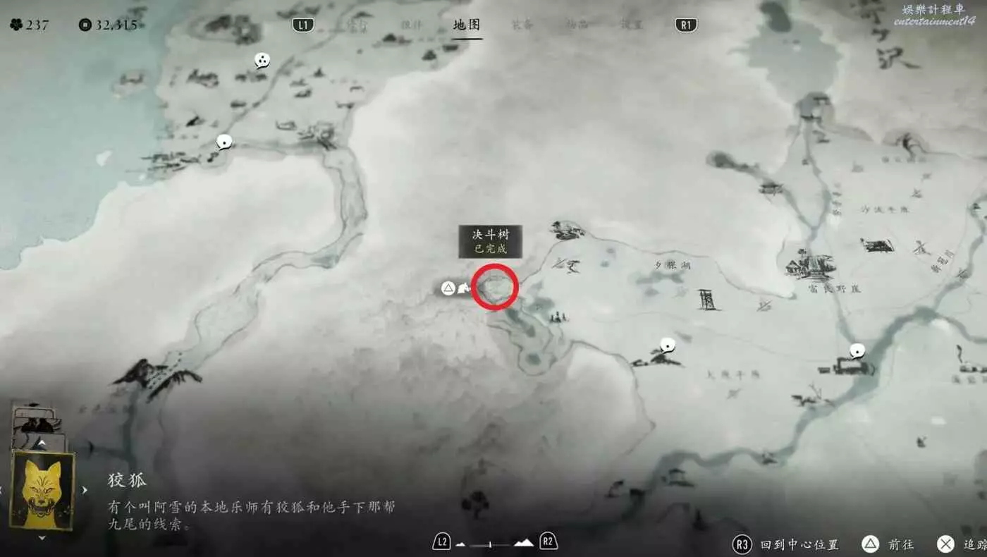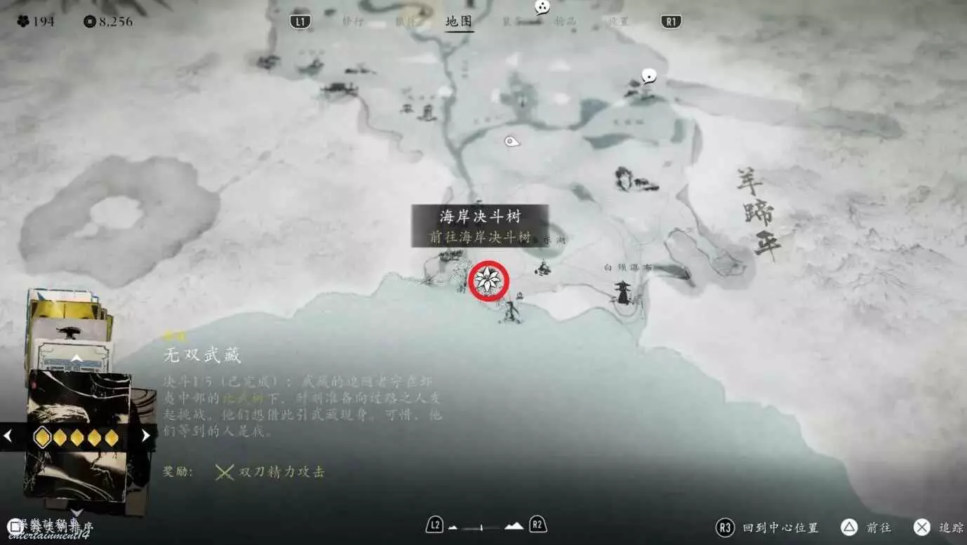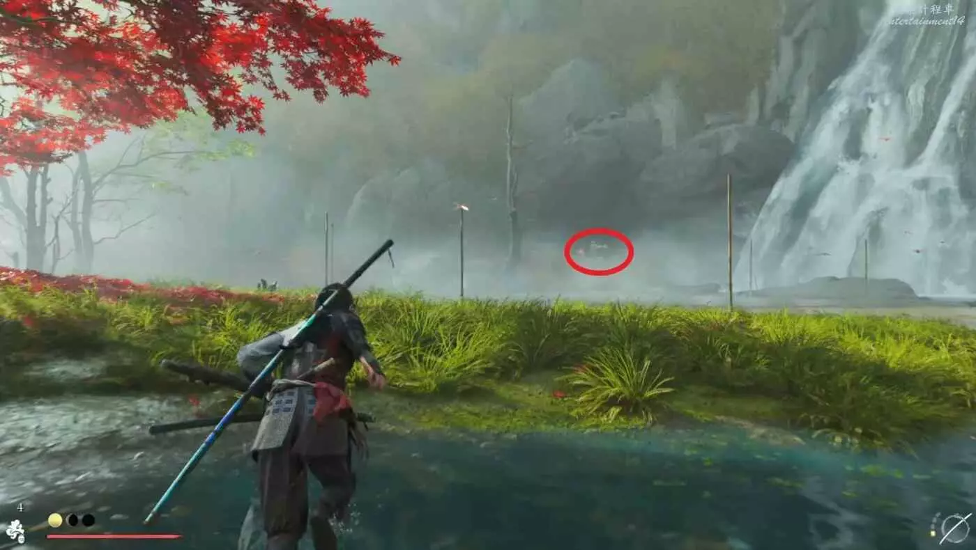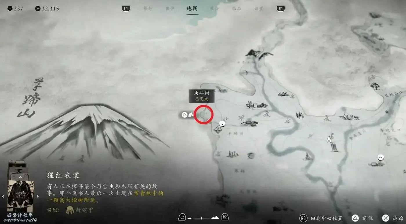 敵人就在樹下等著,靠近觸發戰鬥,將其擊敗獲得【武藏之頑抗護身符】。