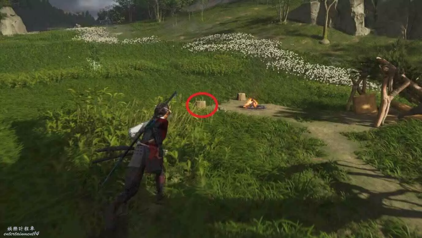 跟此處營地旁邊的木樁子互動,等武藏過來和他一起走到決鬥場地。