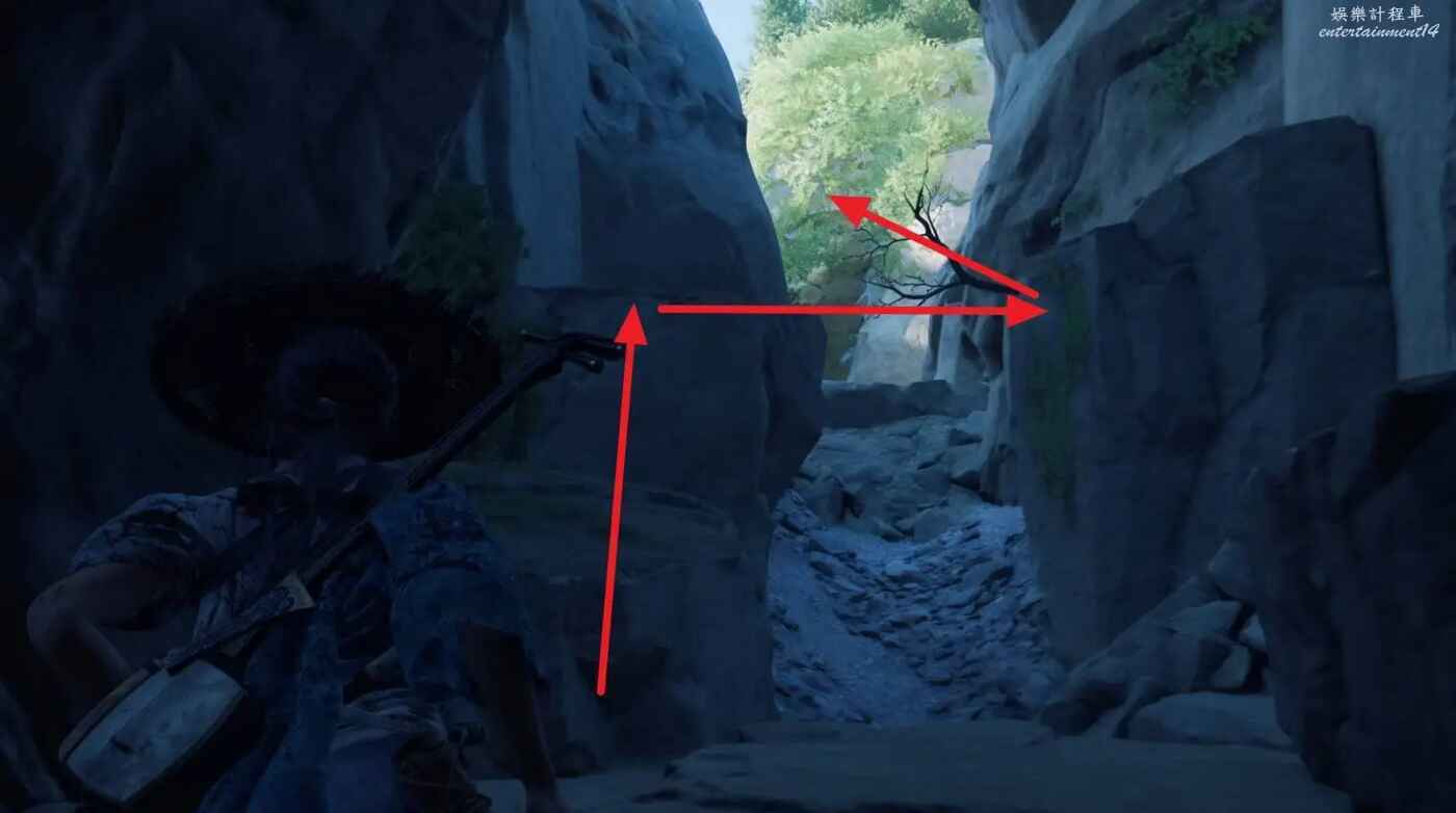 沿路走到盡頭,先跳到左邊台階上往右跳,再扒住對面的樹枝跳到高處。
