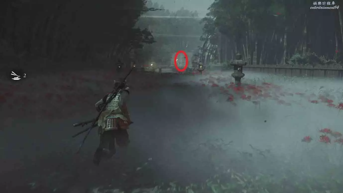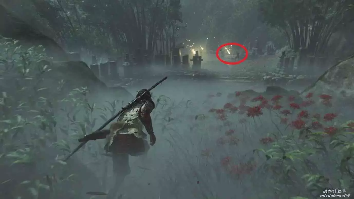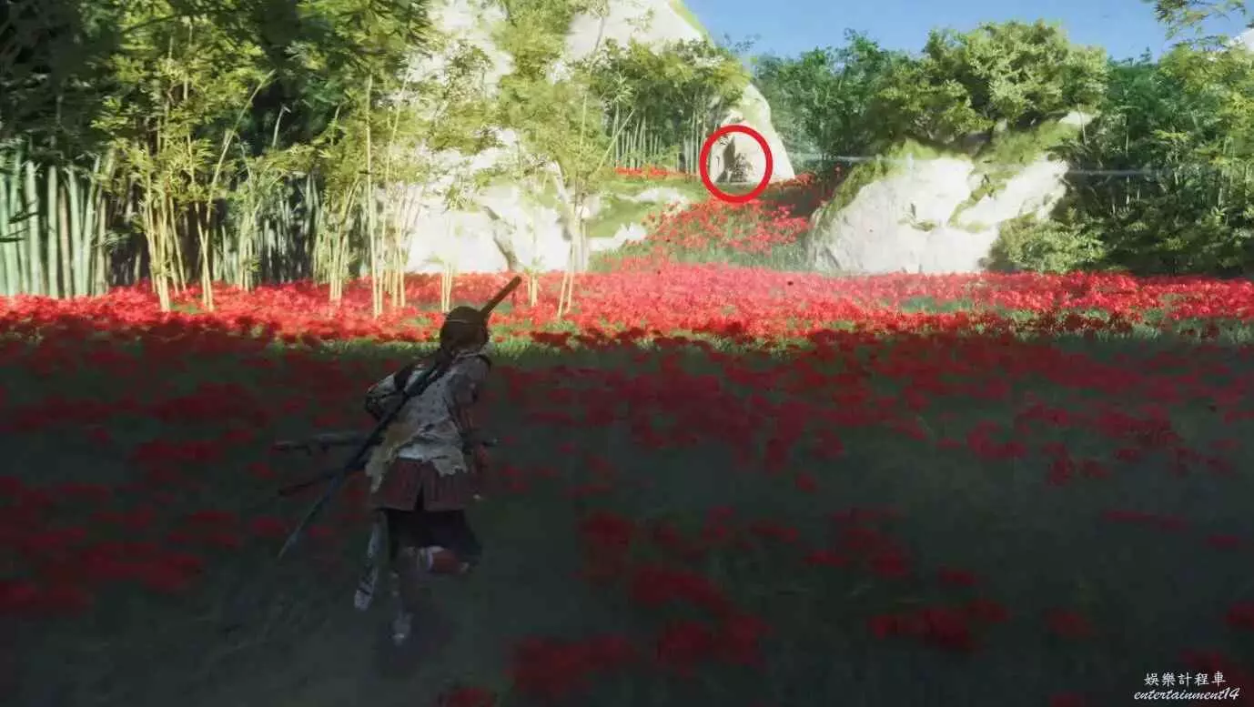 跟著長彼岸花的路走,重複幾次即可完成解謎,最後在竹場中間可拾取【刻印鑰匙三】。