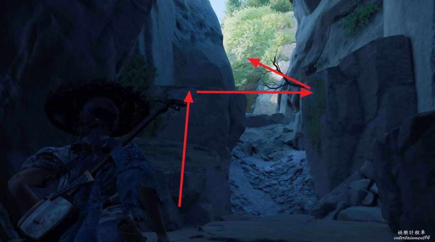 沿路走到盡頭,先跳到左邊台階上往右跳,再扒住對面的樹枝跳到高處。