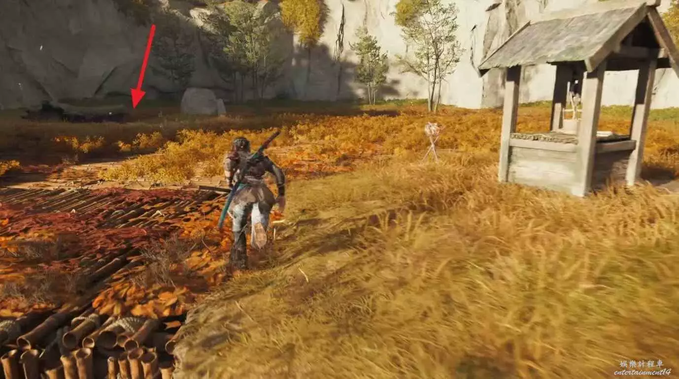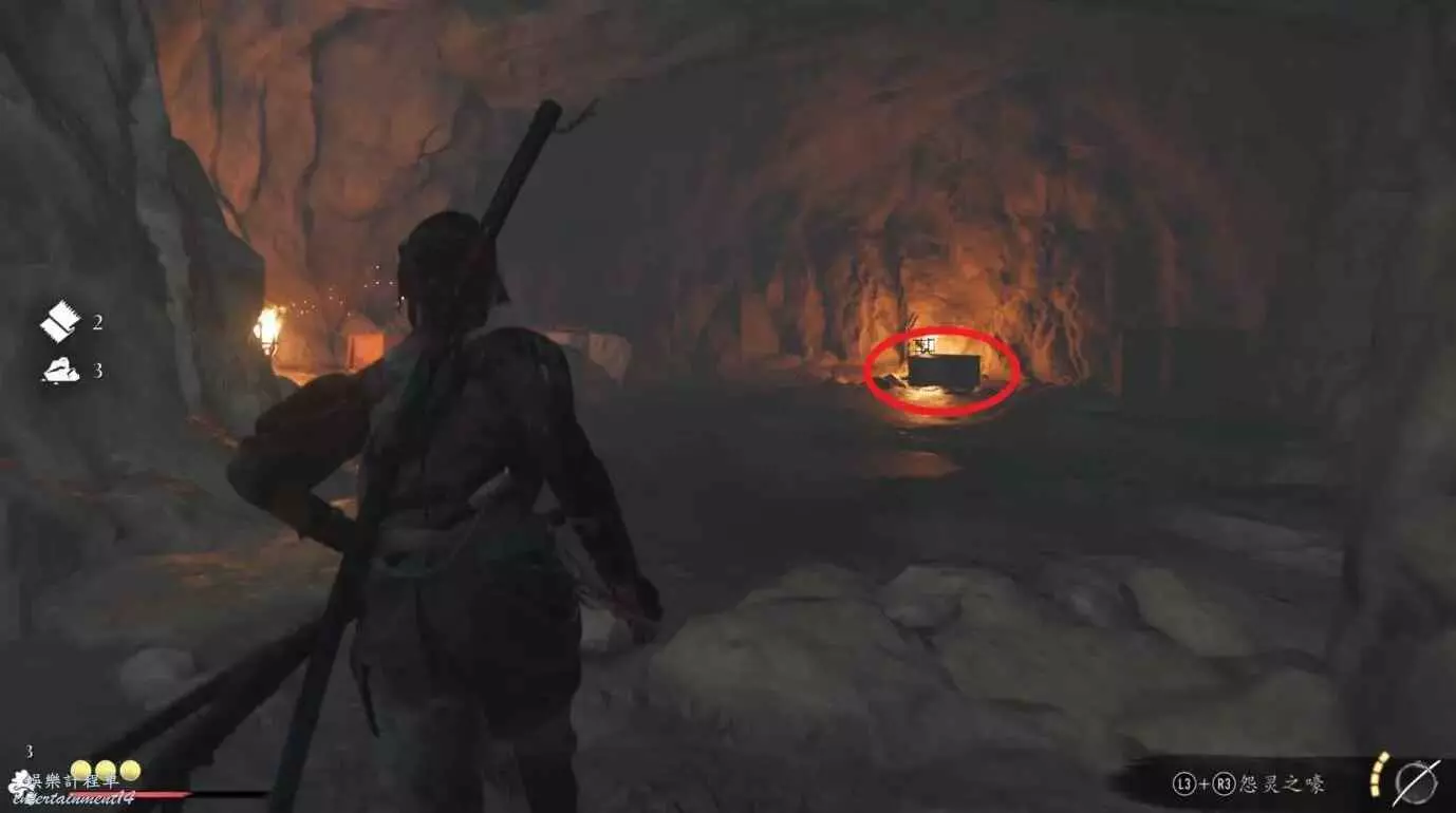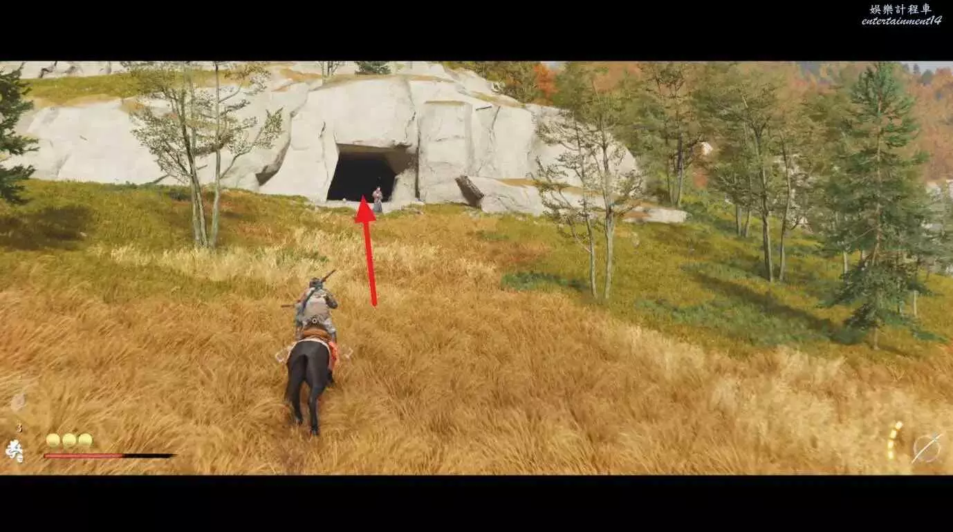 目的地洞口前有個浪人在等待,過去和他對話,一起組隊往裡走。